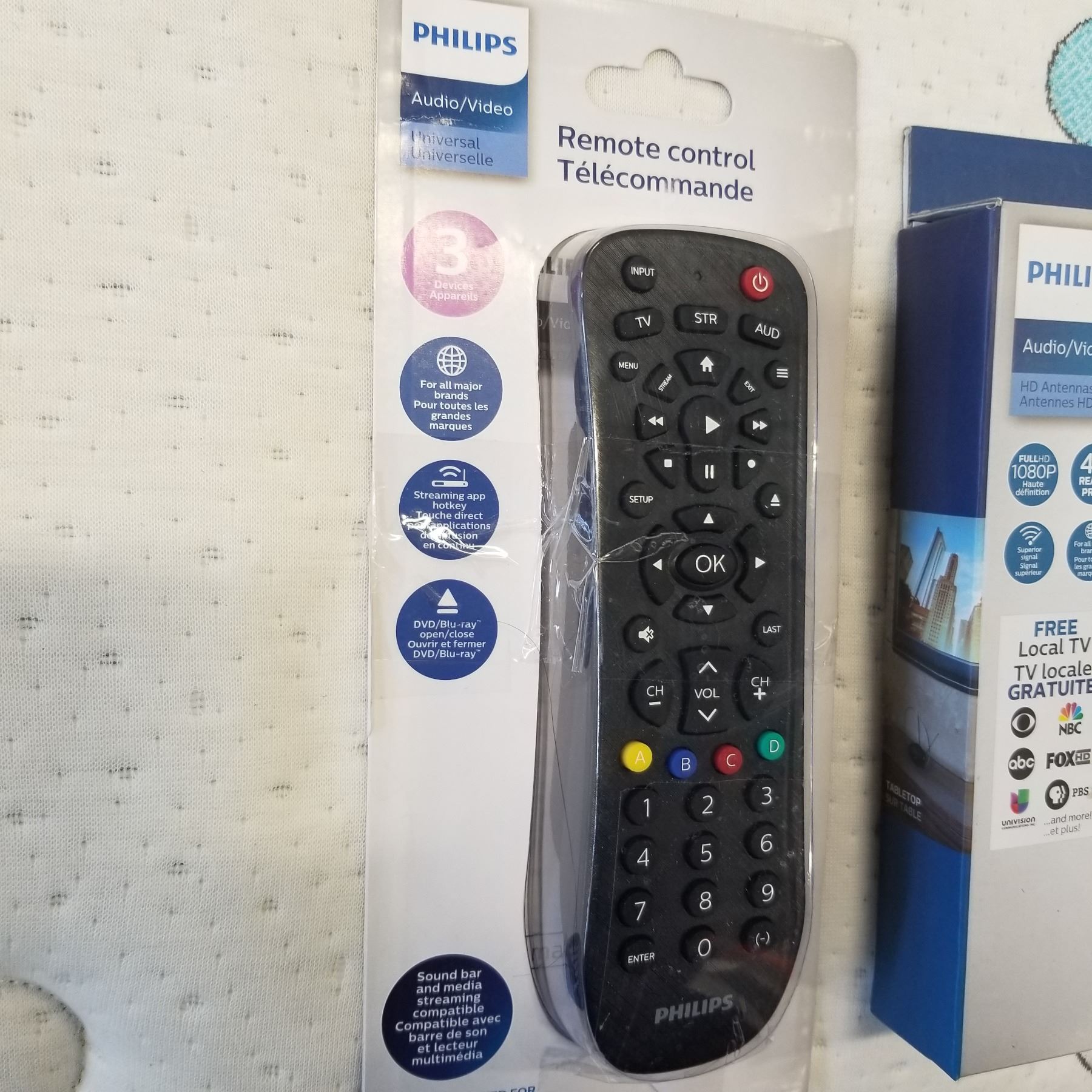 NEW OVERSTOCK PHILIPS CLASSIC HD DIGITAL ANTENNA, 1080P, 4K READY WITH PHILIPS 3 DEVICE UNIVERSAL REMOTE
