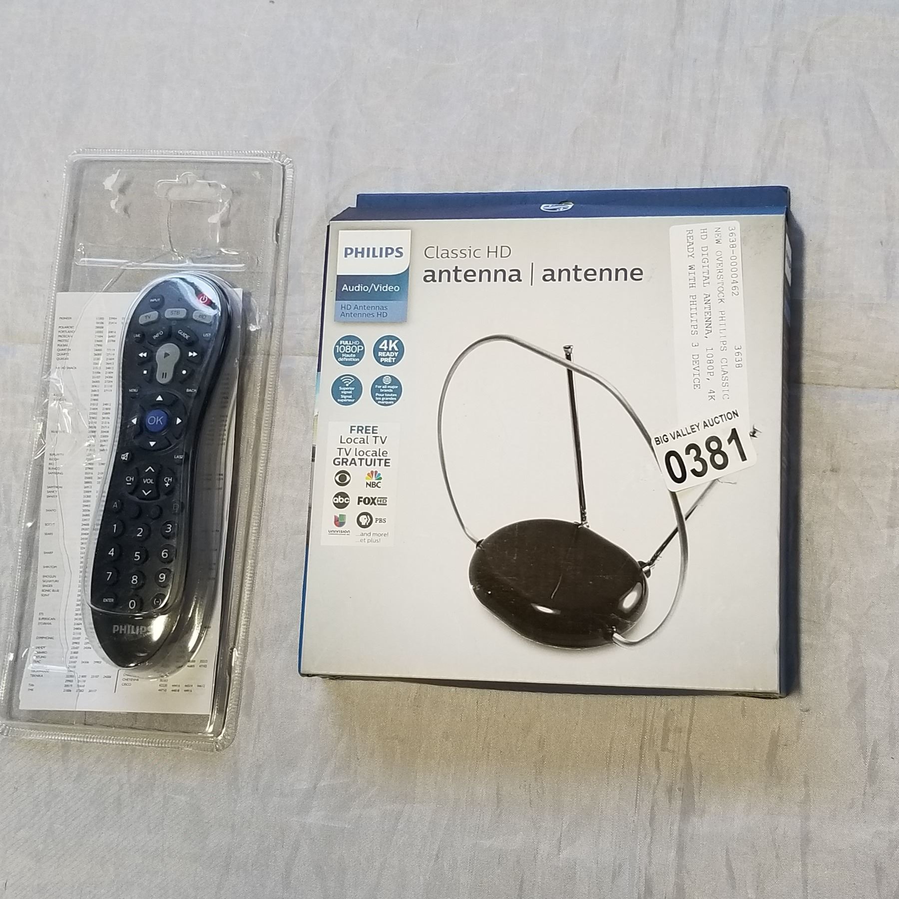 NEW OVERSTOCK PHILIPS CLASSIC HD DIGITAL ANTENNA, 1080P, 4K READY WITH PHILIPS 3 DEVICE UNIVERSAL REMOTE