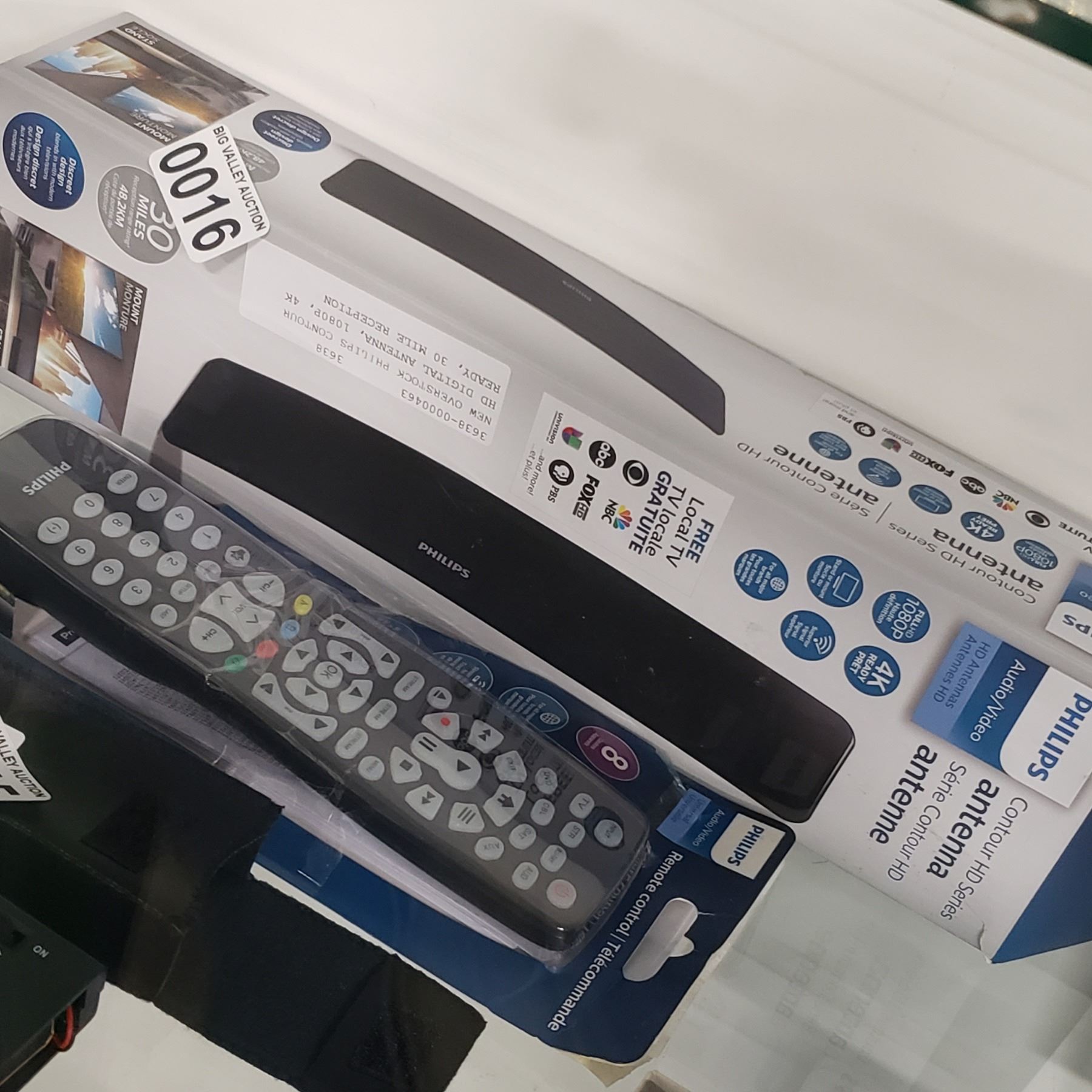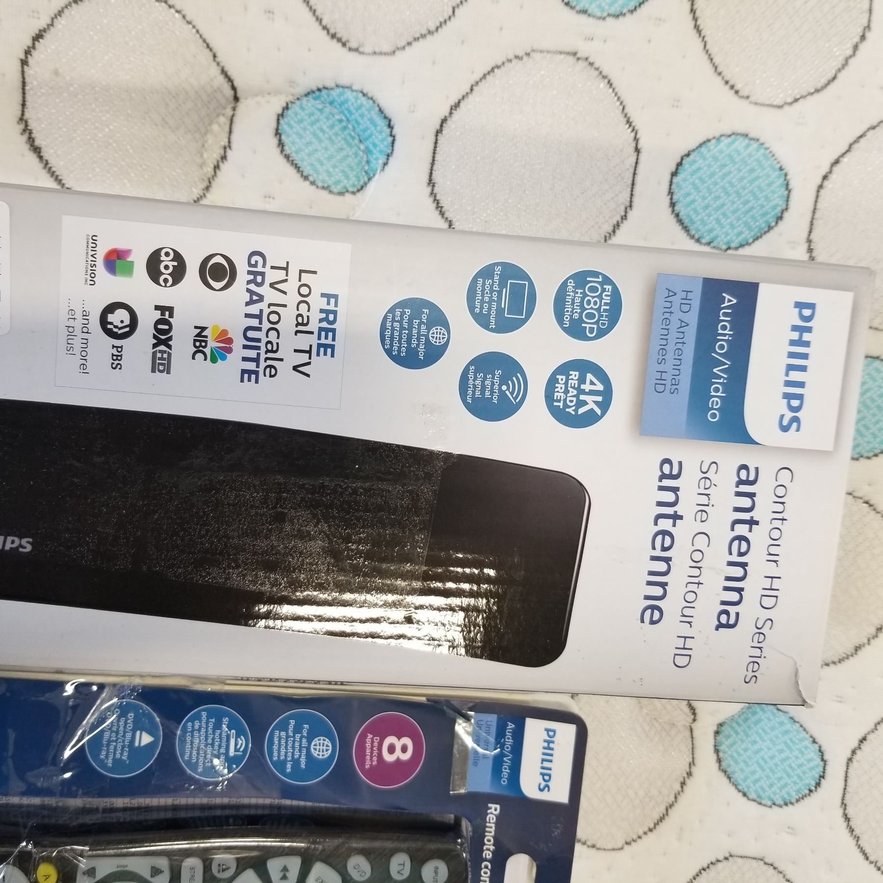 NEW OVERSTOCK PHILIPS CONTOUR HD DIGITAL ANTENNA, 1080P, 4K READY, 30 MILE RECEPTION RATING, WITH PHILIPS ELITE 8 DEVICE UNIVERSAL REMOTE
