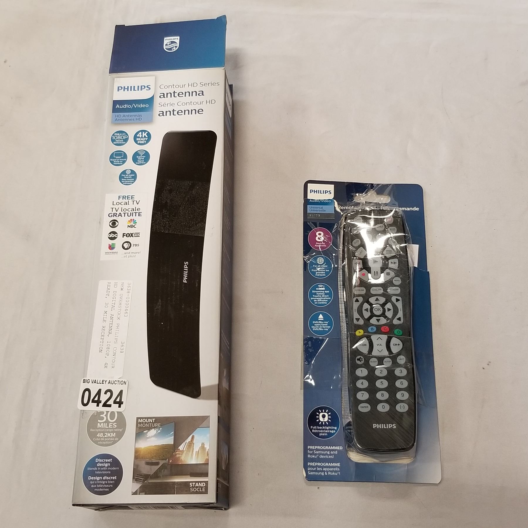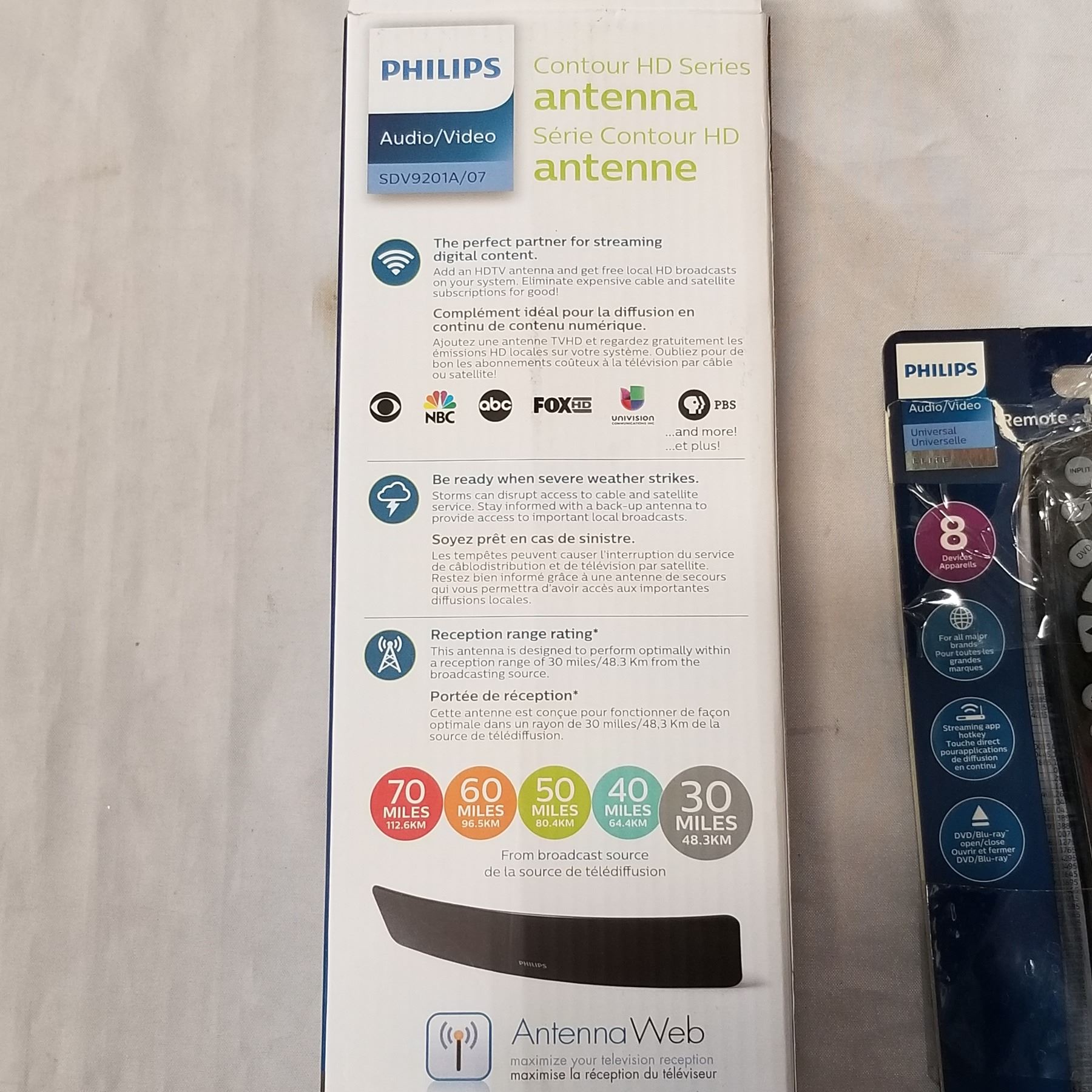 NEW OVERSTOCK PHILIPS CONTOUR HD DIGITAL ANTENNA, 1080P, 4K READY, 30 MILE RECEPTION RATING, WITH PHILIPS ELITE 8 DEVICE UNIVERSAL REMOTE