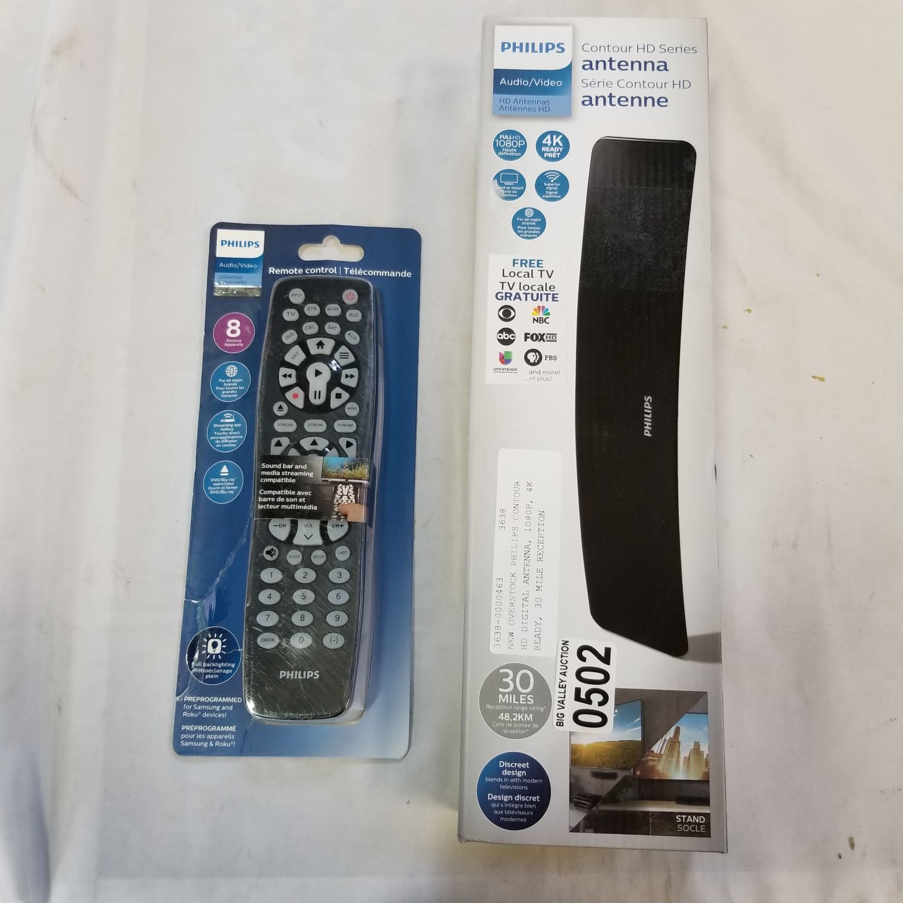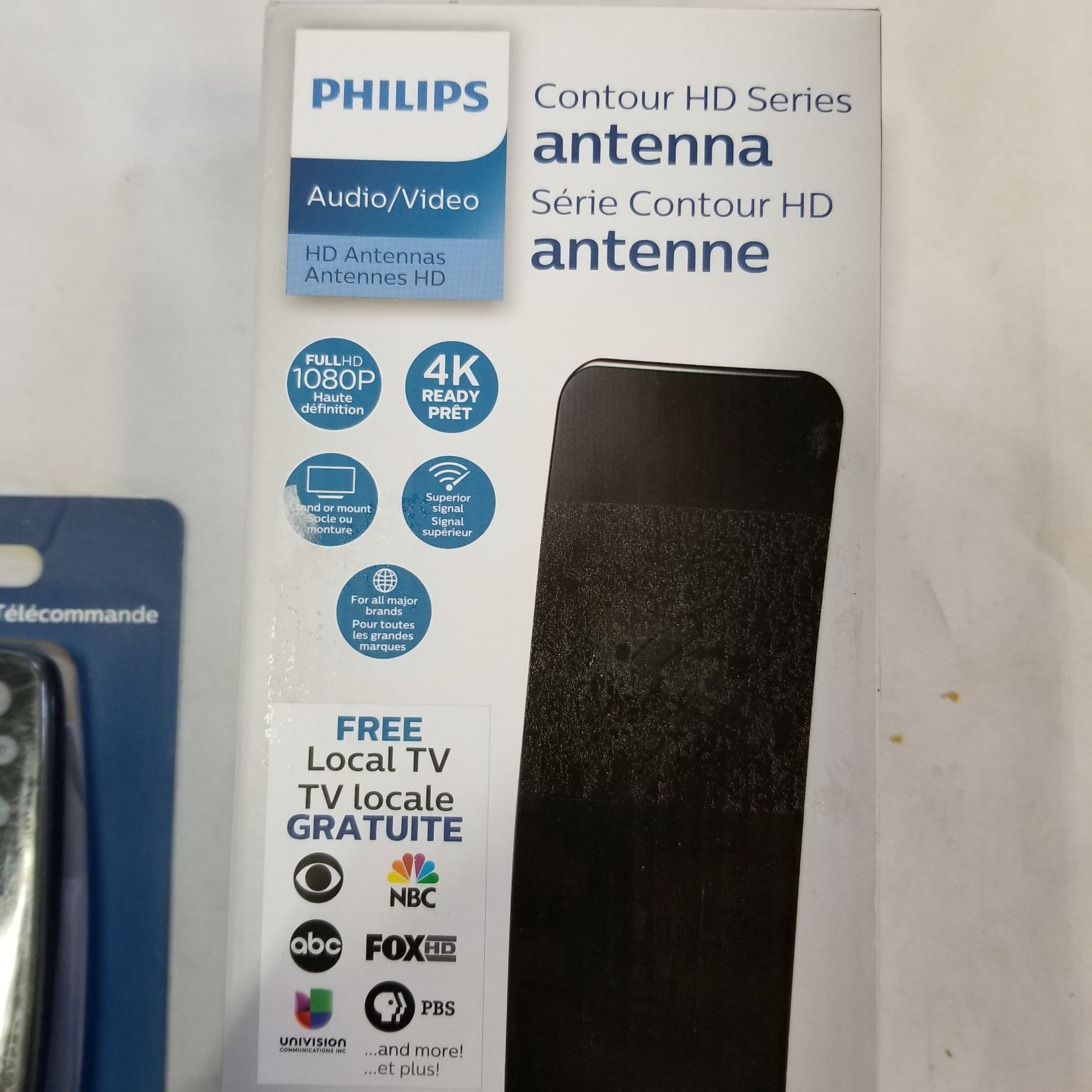 NEW OVERSTOCK PHILIPS CONTOUR HD DIGITAL ANTENNA, 1080P, 4K READY, 30 MILE RECEPTION RATING, WITH PHILIPS ELITE 8 DEVICE UNIVERSAL REMOTE