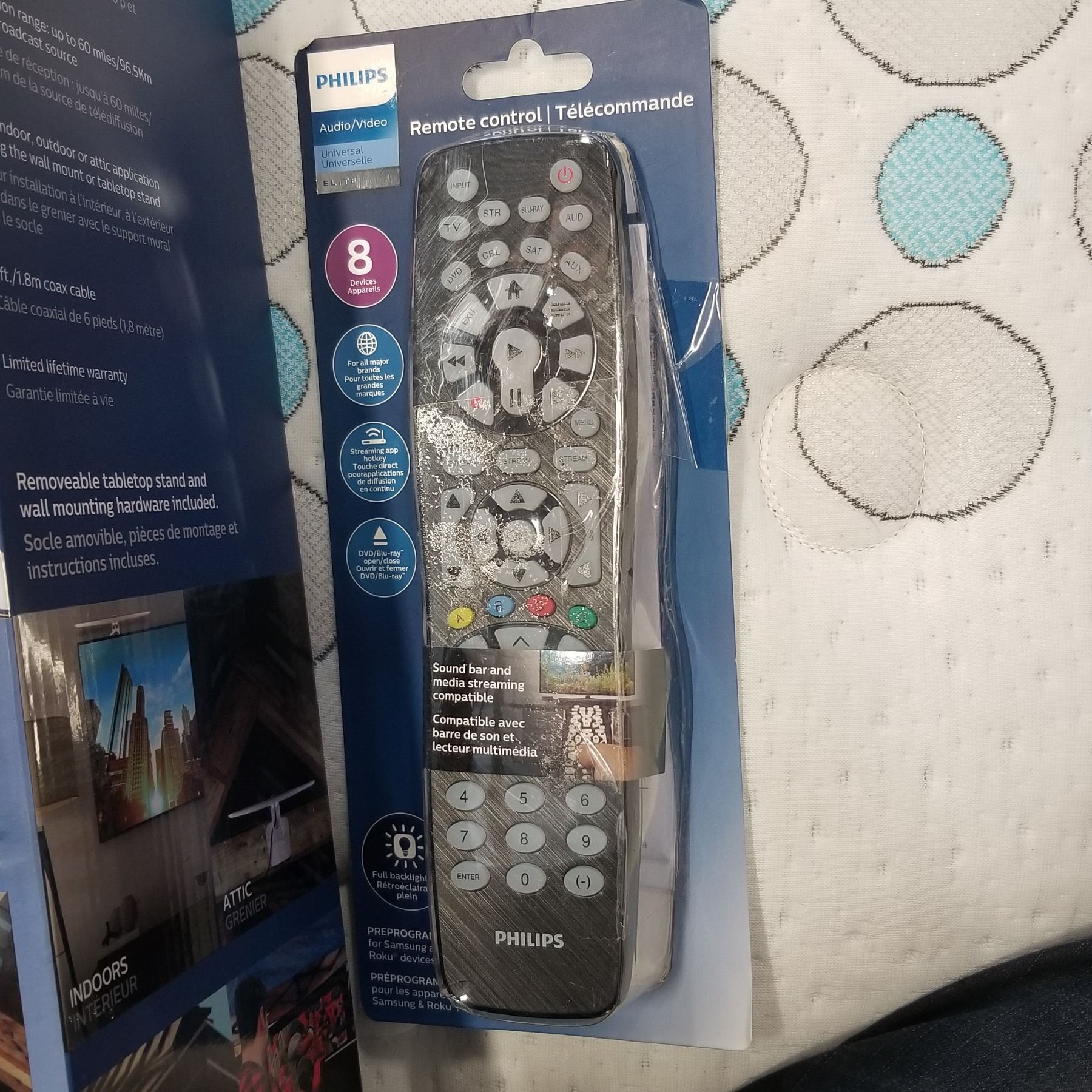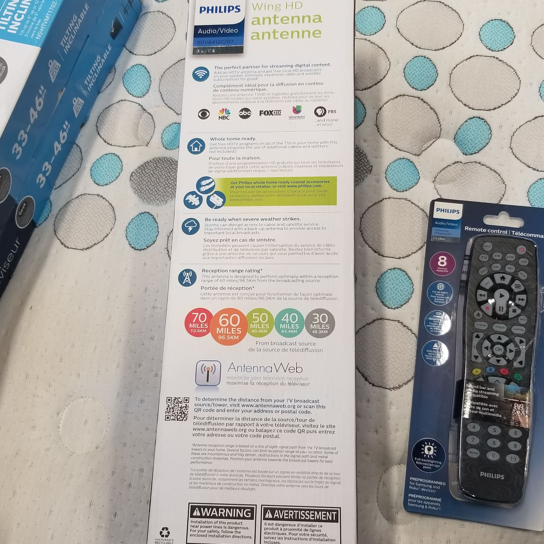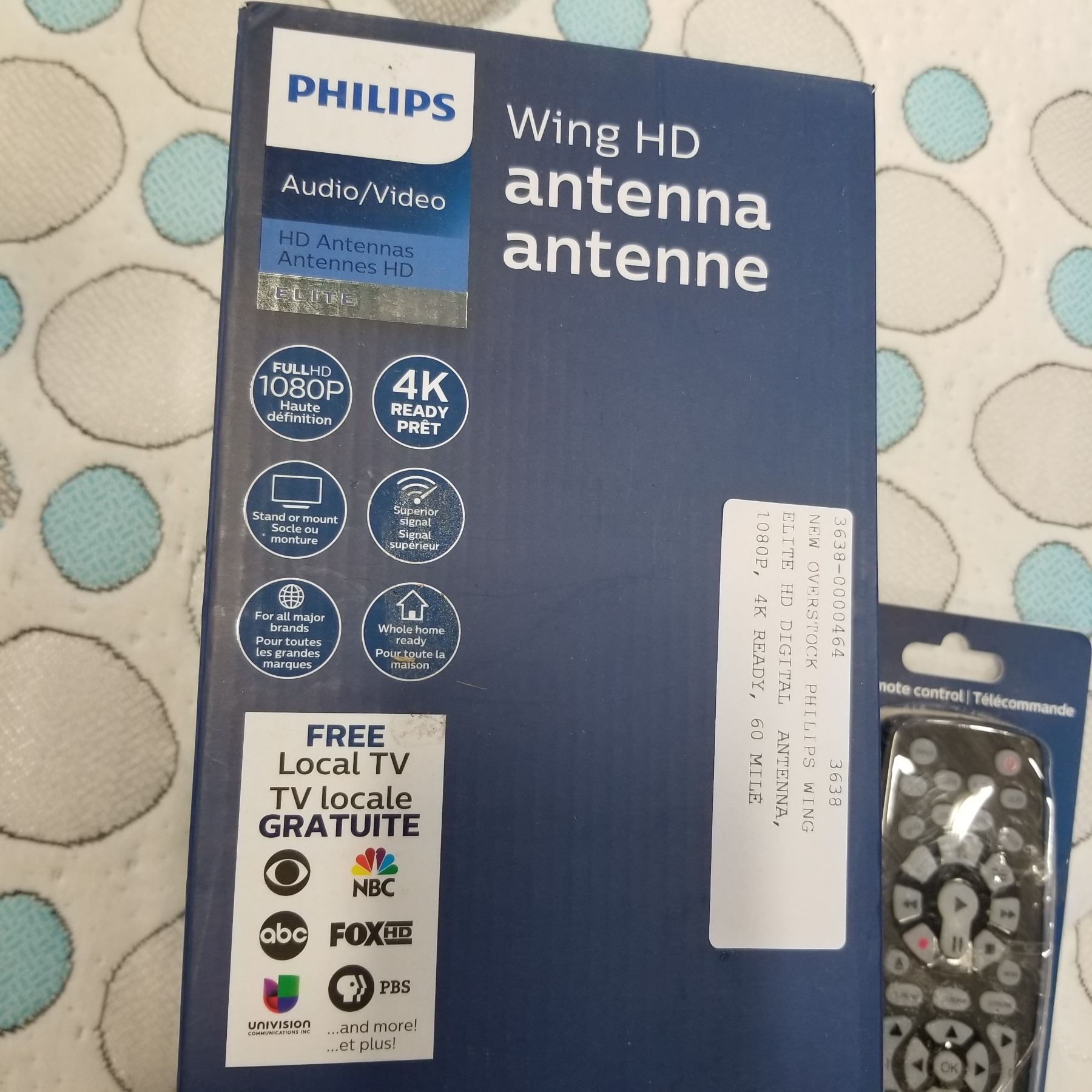 NEW OVERSTOCK PHILIPS WING ELITE HD DIGITAL ANTENNA, 1080P, 4K READY, 60 MILE RECEPTION RATING, WITH PHILIPS ELITE 8 DEVICE UNIVERSAL REMOTE