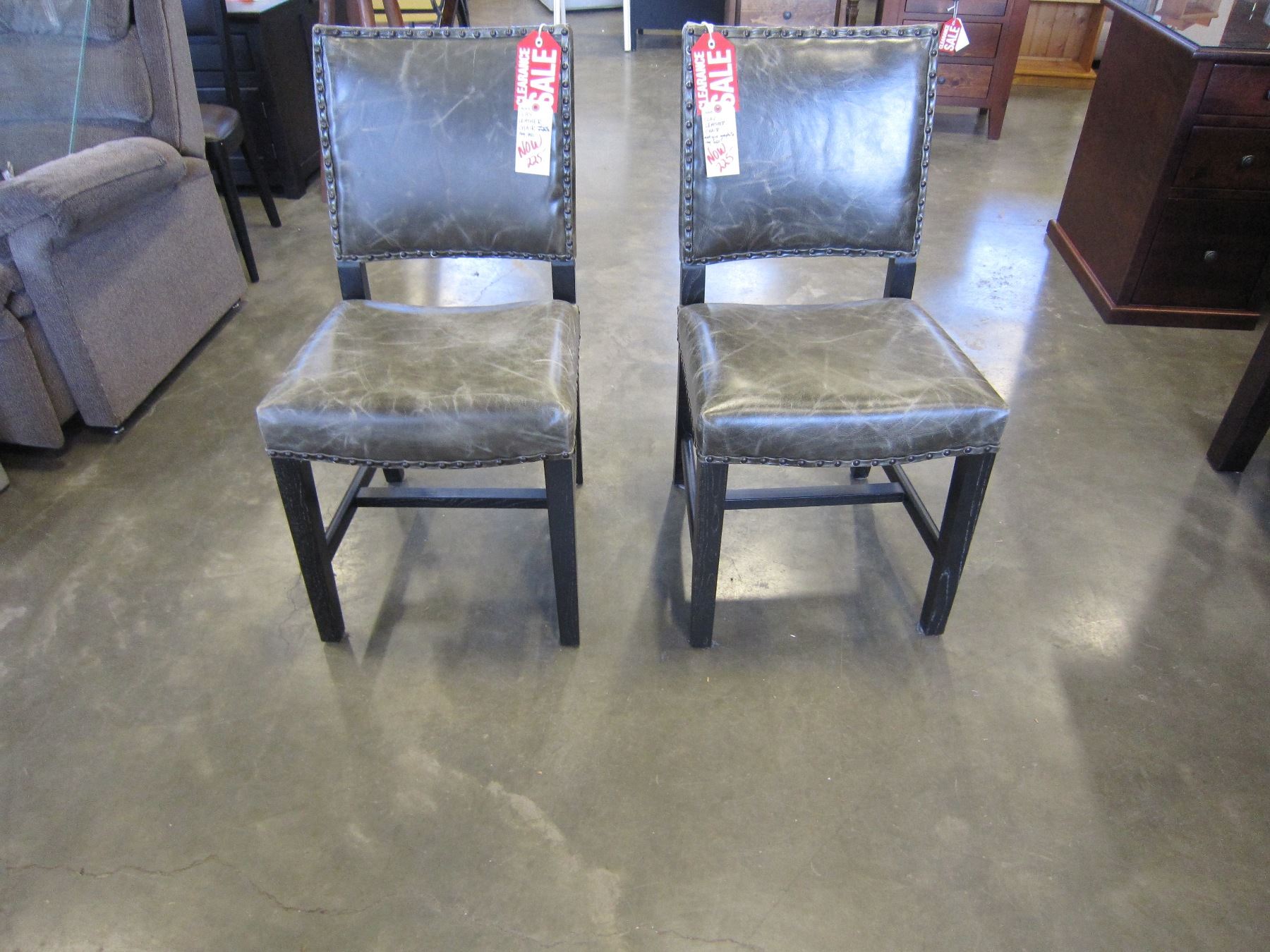 NEW PAIR OF ANTIQUE GREY LEATHER DININD CHAIRS W/ NAIL HEADS - WHOLESALE PRICE $250EA, CURRENT RETAIL $375EA