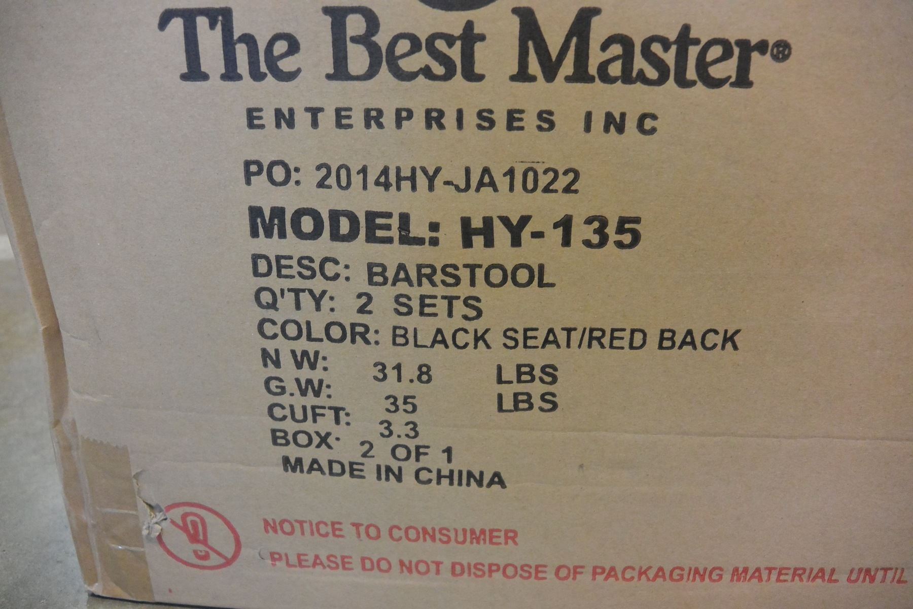 NEW PAIR OF MODERN BLACK/RED WITH CHROME BASE ADJUSTABLE HEIGHT BARSTOOLS, RETAIL $280 PAIR