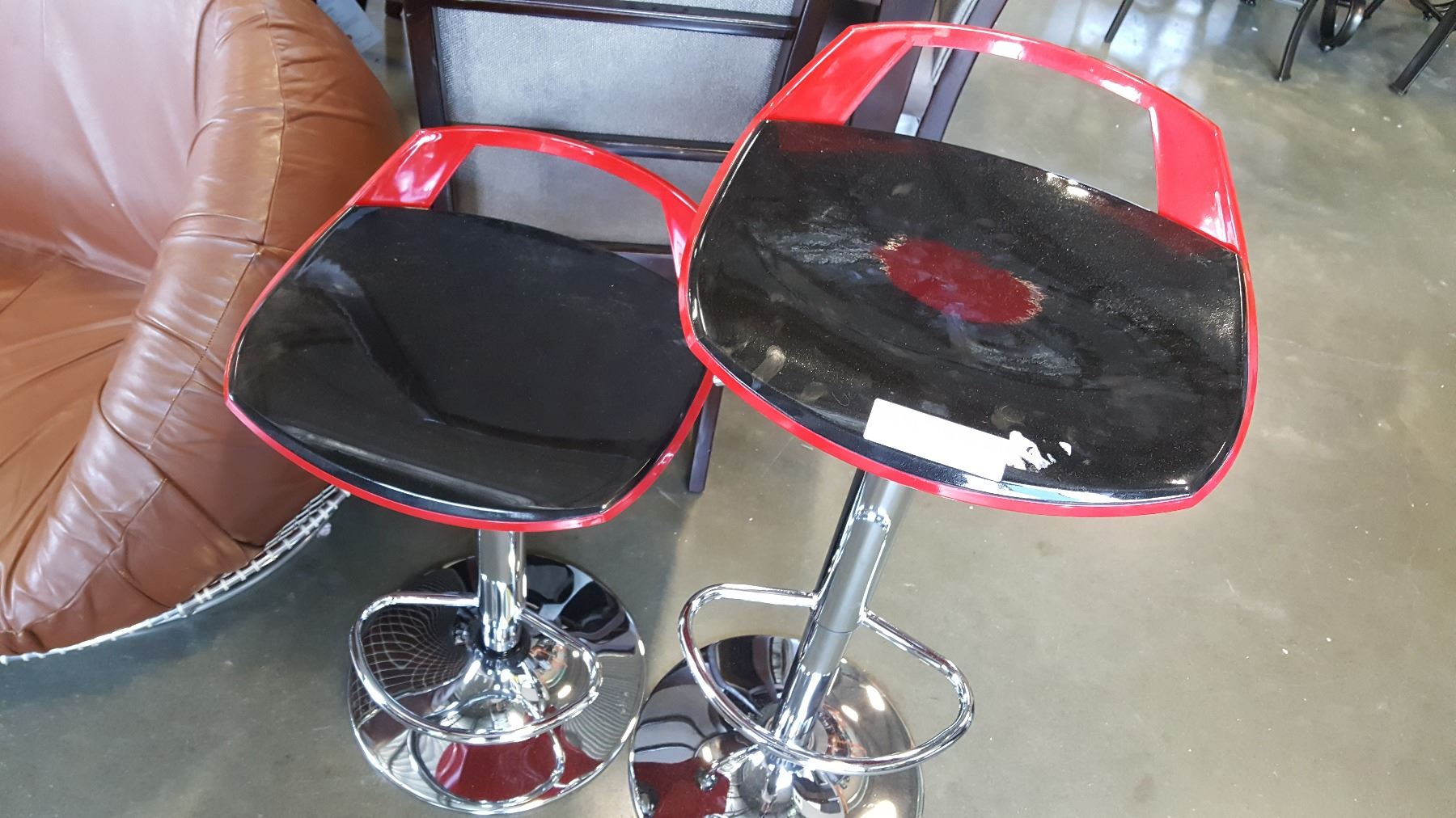 NEW PAIR OF MODERN BLACK/RED WITH CHROME BASE ADJUSTABLE HEIGHT BARSTOOLS, RETAIL $280 PAIR