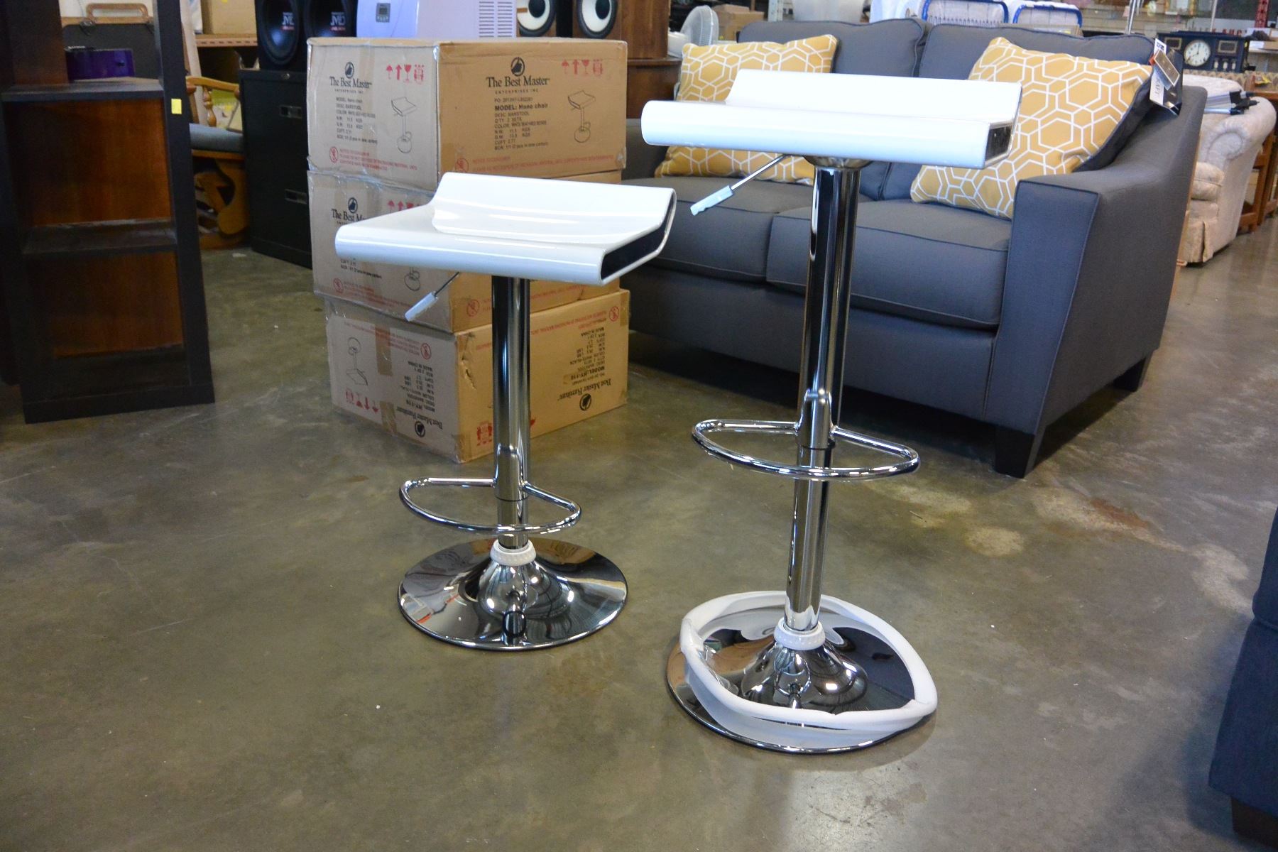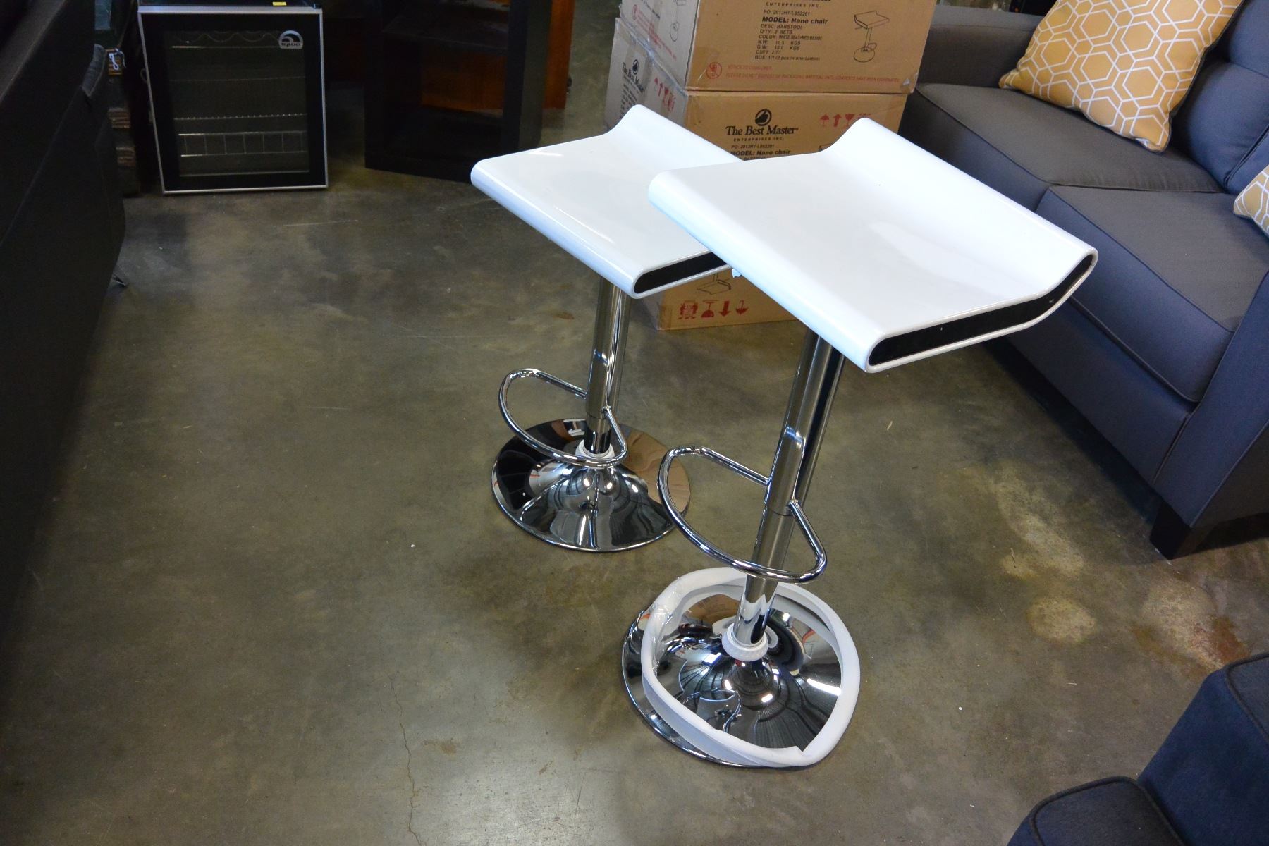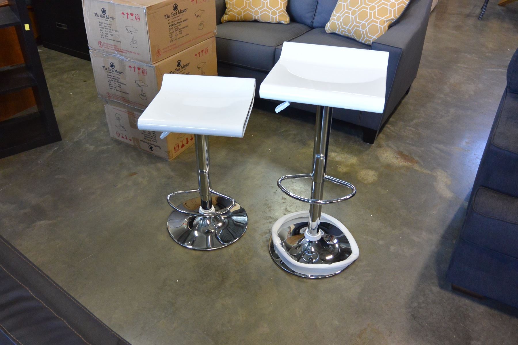 NEW PAIR OF MODERN WHITE/BLACK CHROME BASE ADJUSTABLE HEIGHT BARSTOOLS, RETAIL $280 PAIR