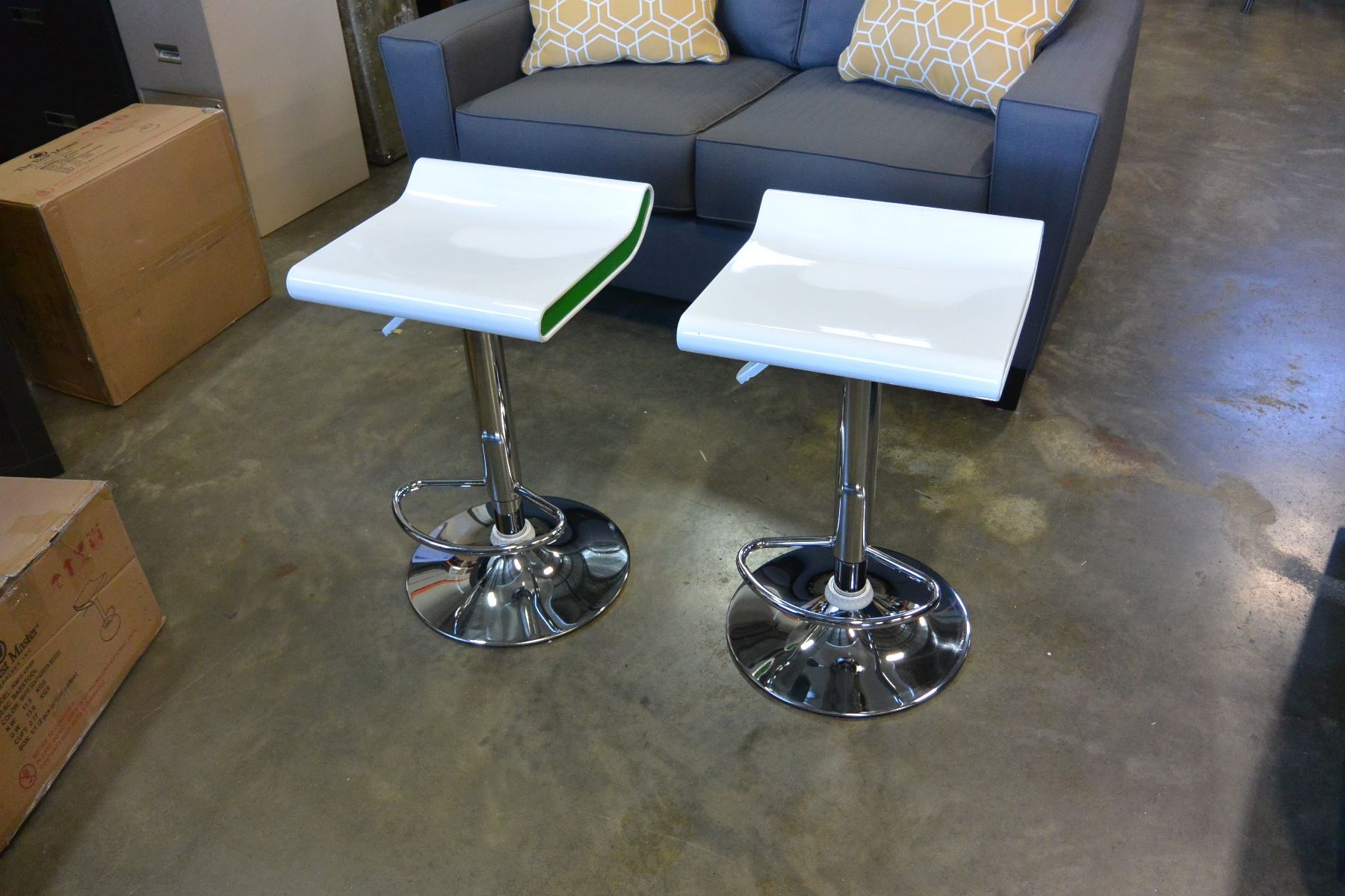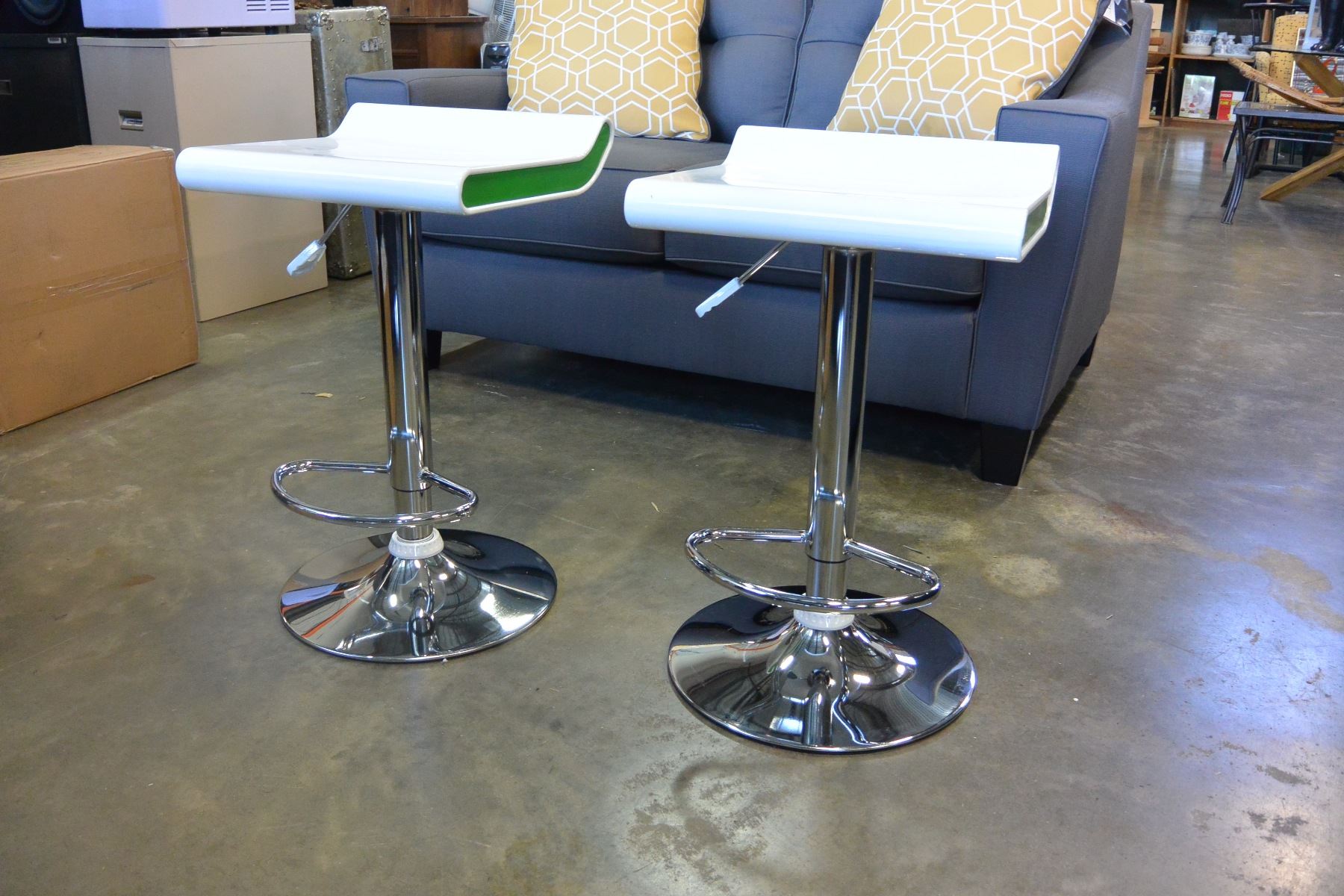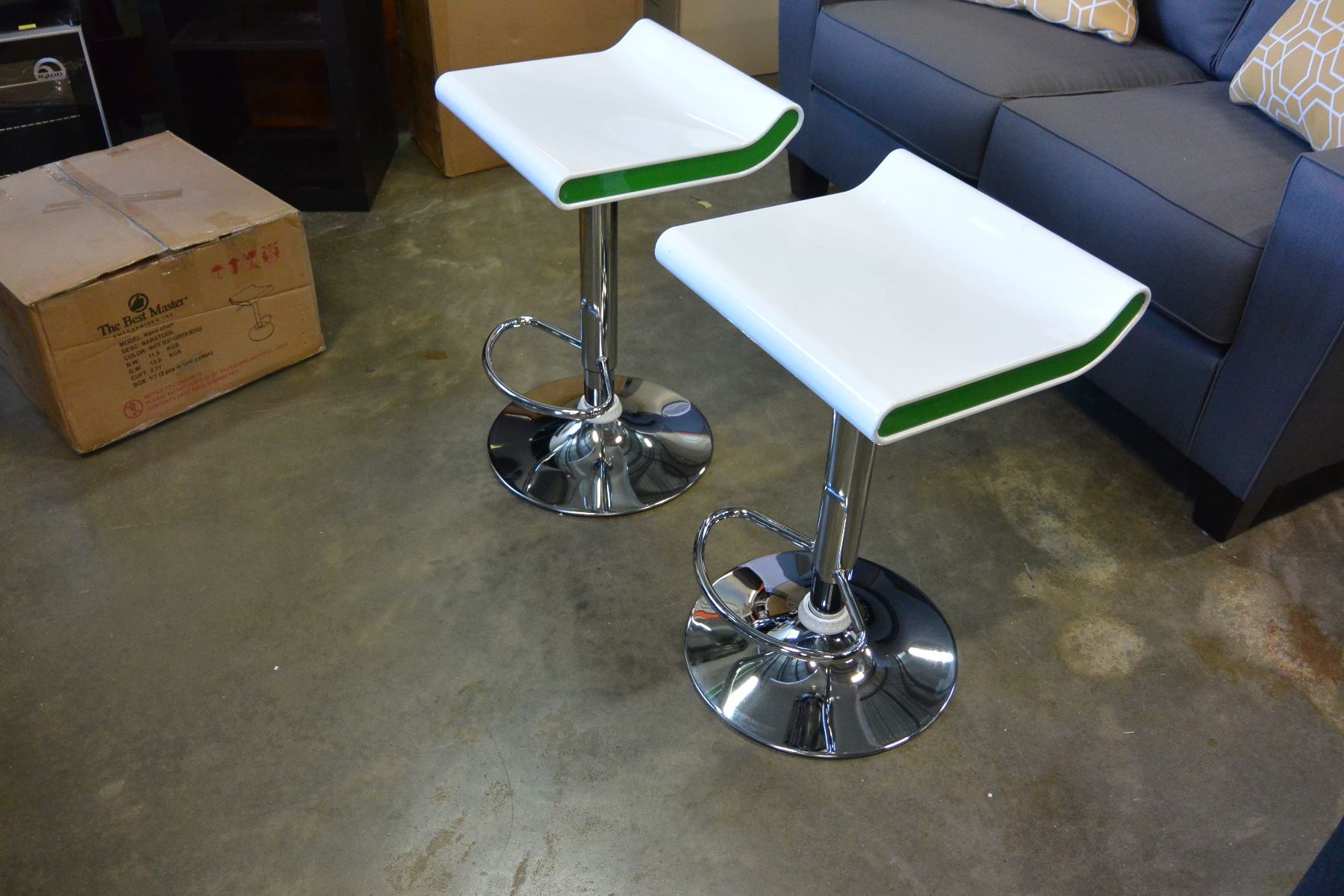NEW PAIR OF MODERN WHITE/GREEN WITH CHROME BASE ADJUSTABLE HEIGHT BARSTOOLS, RETAIL $280 PAIR