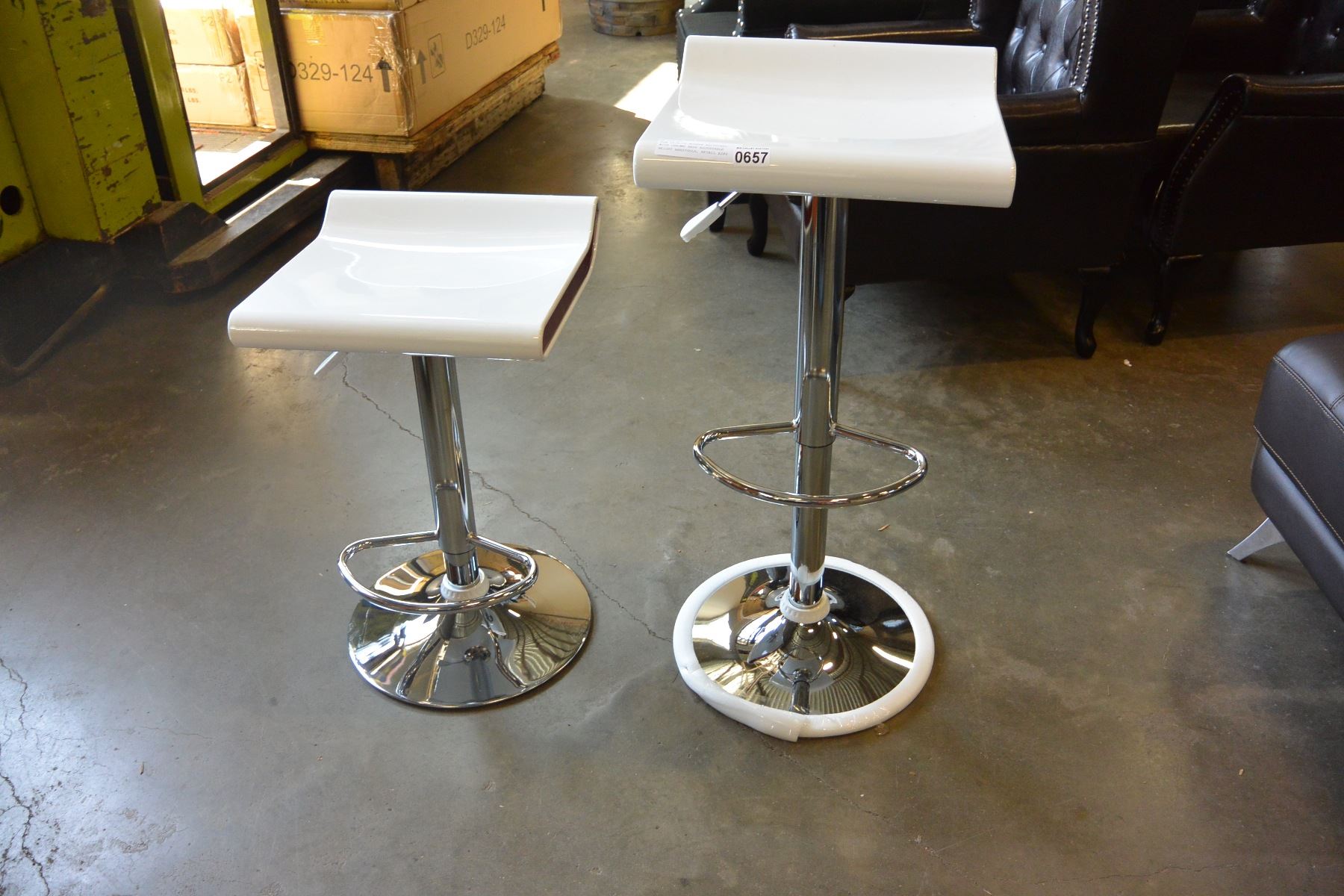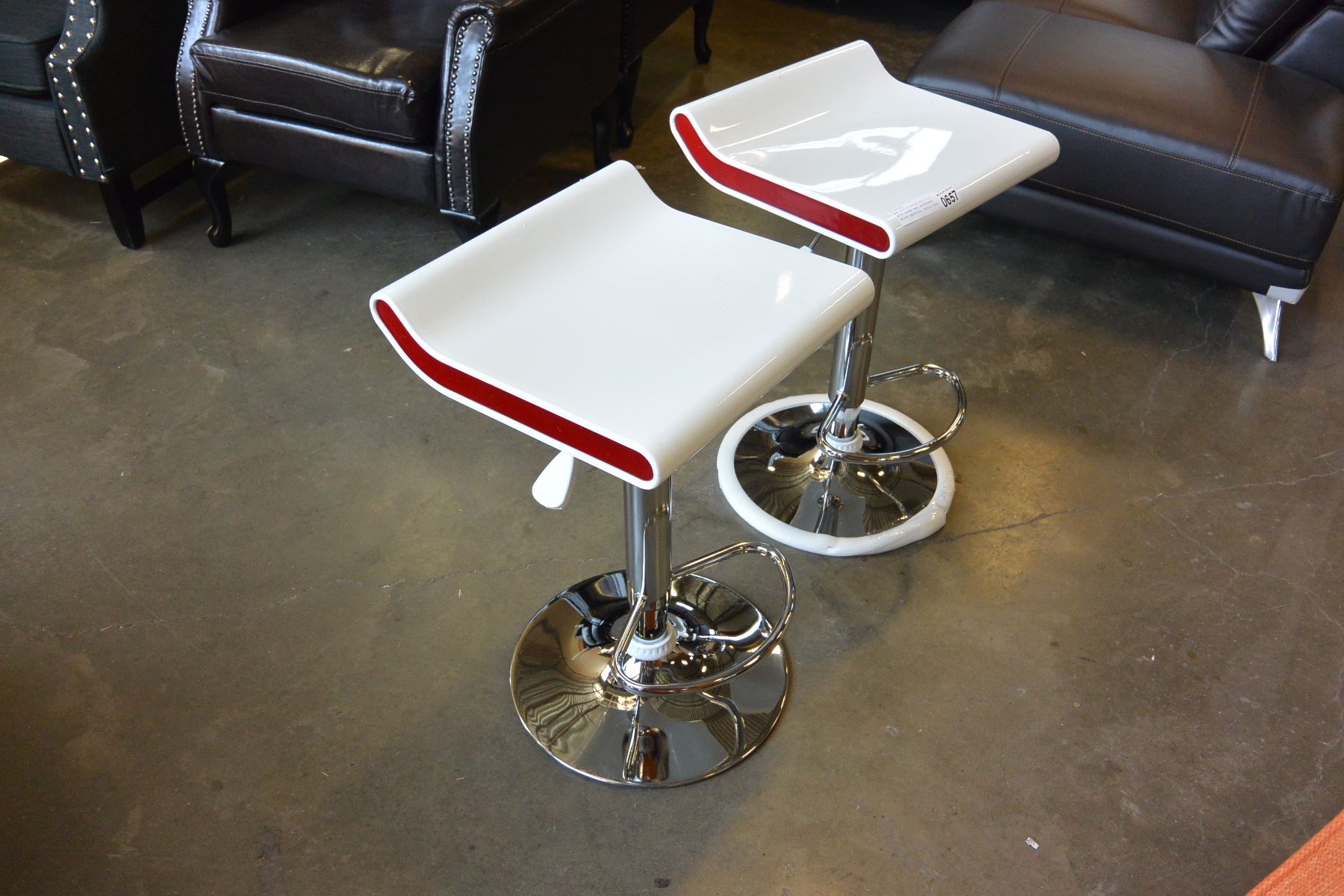 NEW PAIR OF MODERN WHITE/RED WITH CHROME BASE ADJUSTABLE HEIGHT BARSTOOLS, RETAIL $280 PAIR