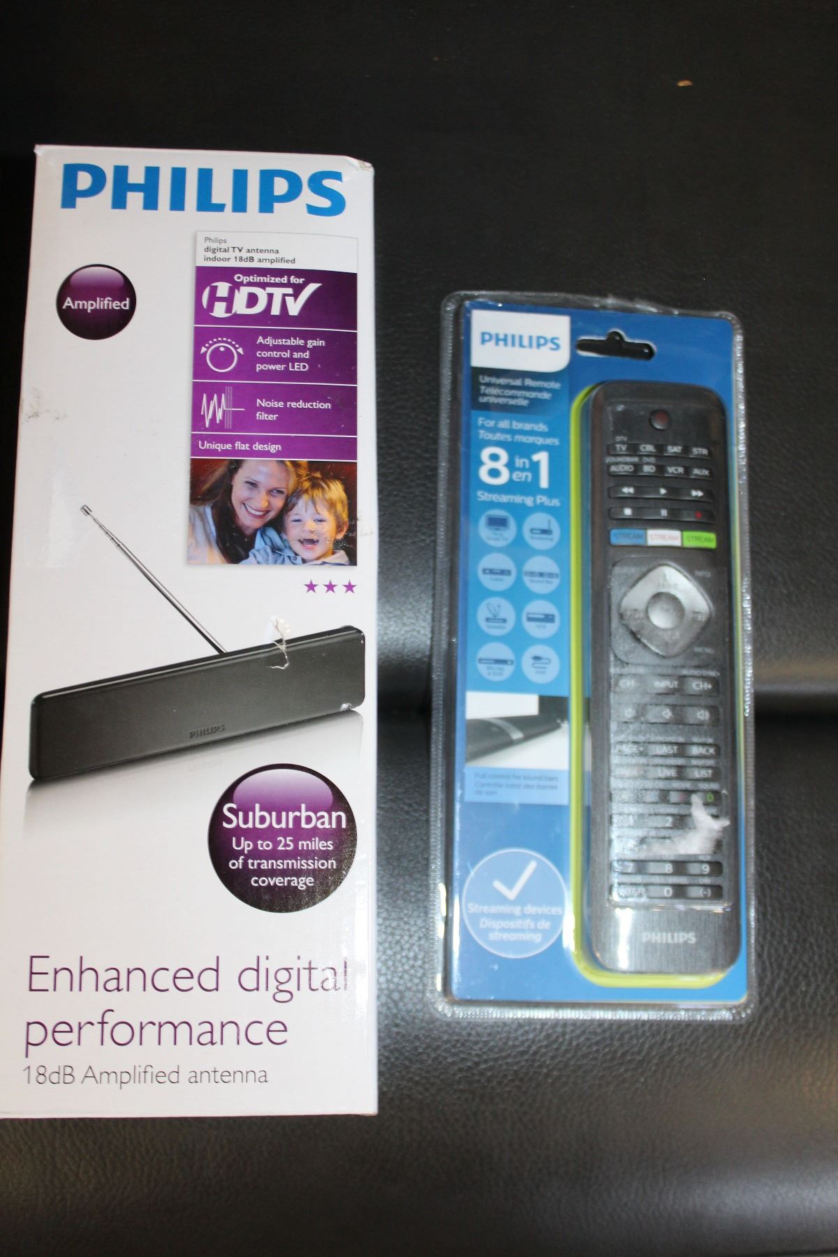 NEW PHILLIPS HDTV 18DB AMPLIFIED DIGITAL ANTENNA AND NEW 8 IN 1 REMOTE