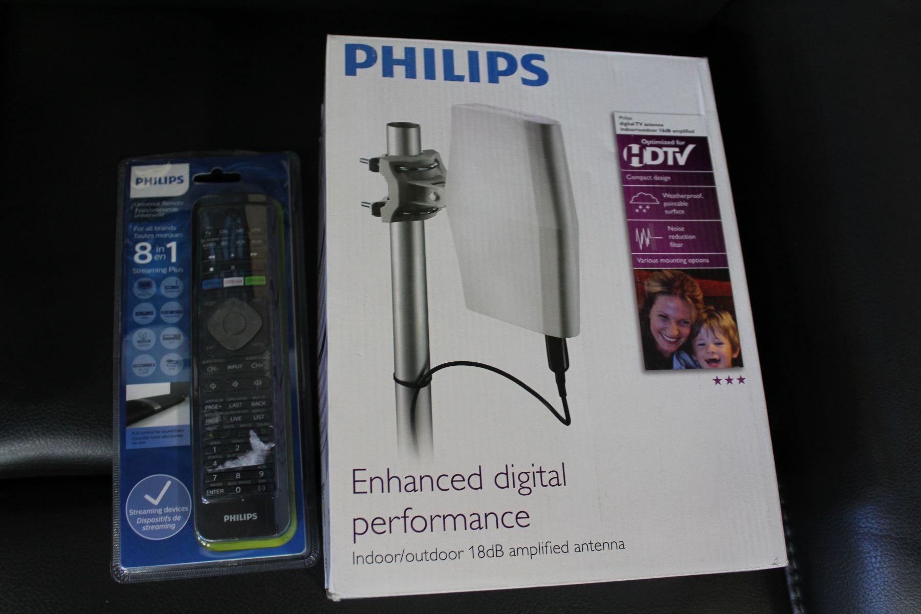 NEW PHILLIPS HDTV INDOOR OUTDOOR 18DB AMPLIFIED DIGITAL ANTENNA AND NEW 8 IN 1 REMOTE