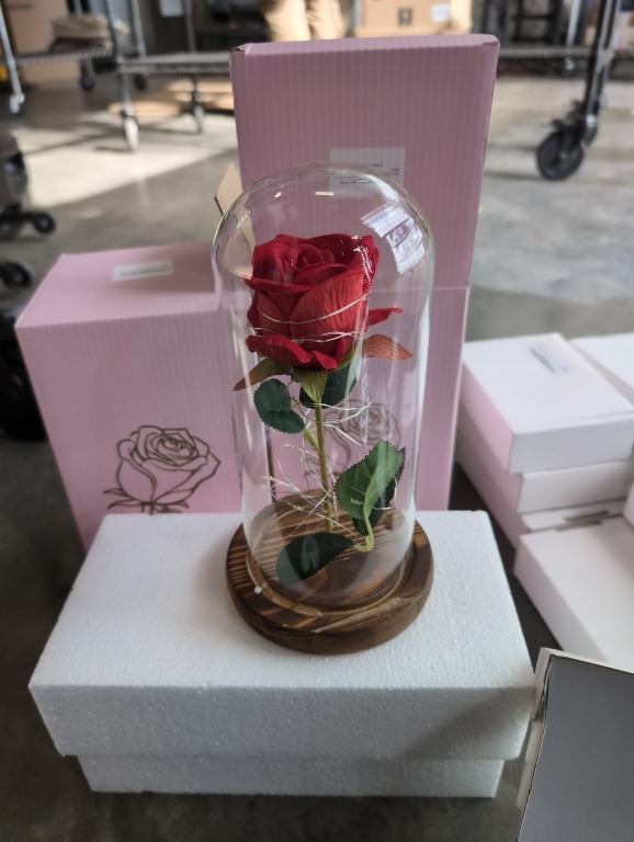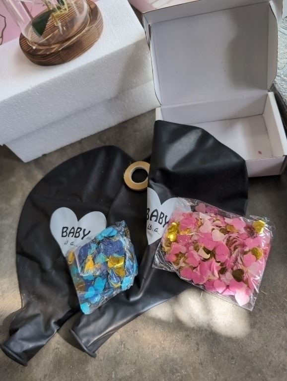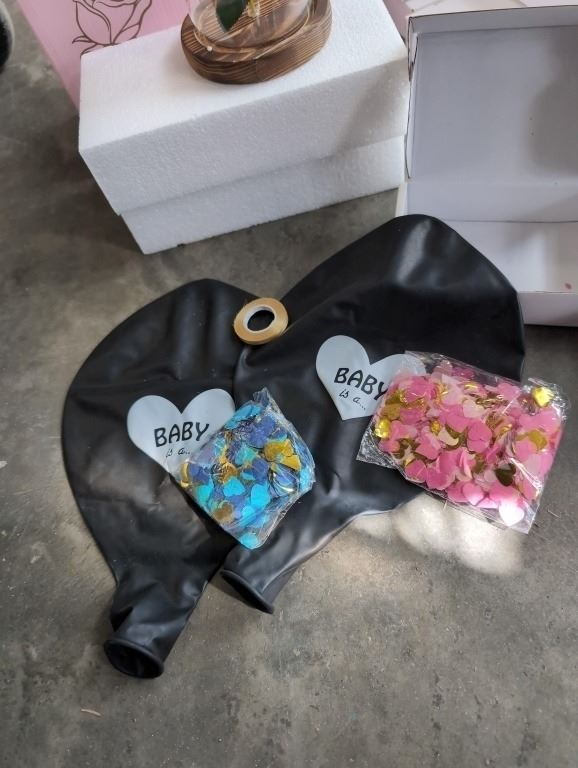 NEW PHOTO ALBUM, 2 ROSES/ARTIFICIAL FLOWER IN DISPLAY CASE WITH 10 BABY GENDER REVEAL KITS