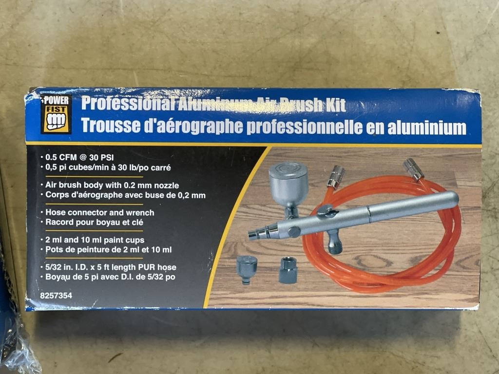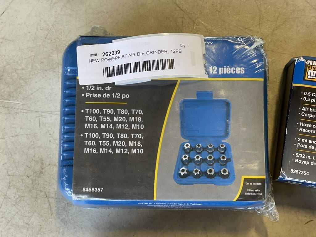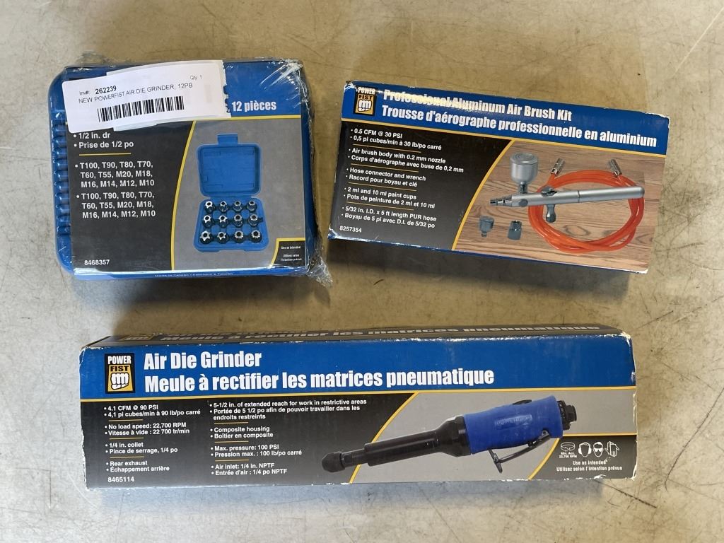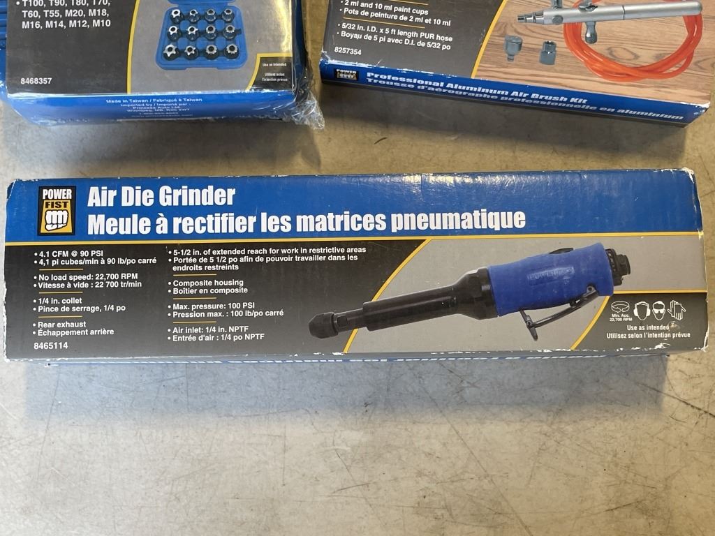 NEW POWERFIST AIR DIE GRINDER, 12PB TAMPER PROOF BIT SET, AND PROFESSIONAL ALUMINUM AIR BRUSH KIT