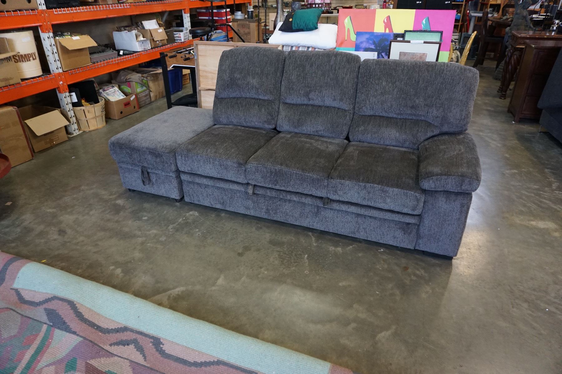 NEW PRIMO FABRIC COUCH W/ PULL OUT BED AND STORAGE END PIECE