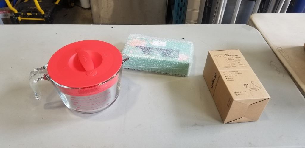 NEW PYREX PREPWARE 2 QUART GLASS MEASURING CUP WITH LID AND ELECTRIC COFFEE GRINDER AND BINCA VIDOU