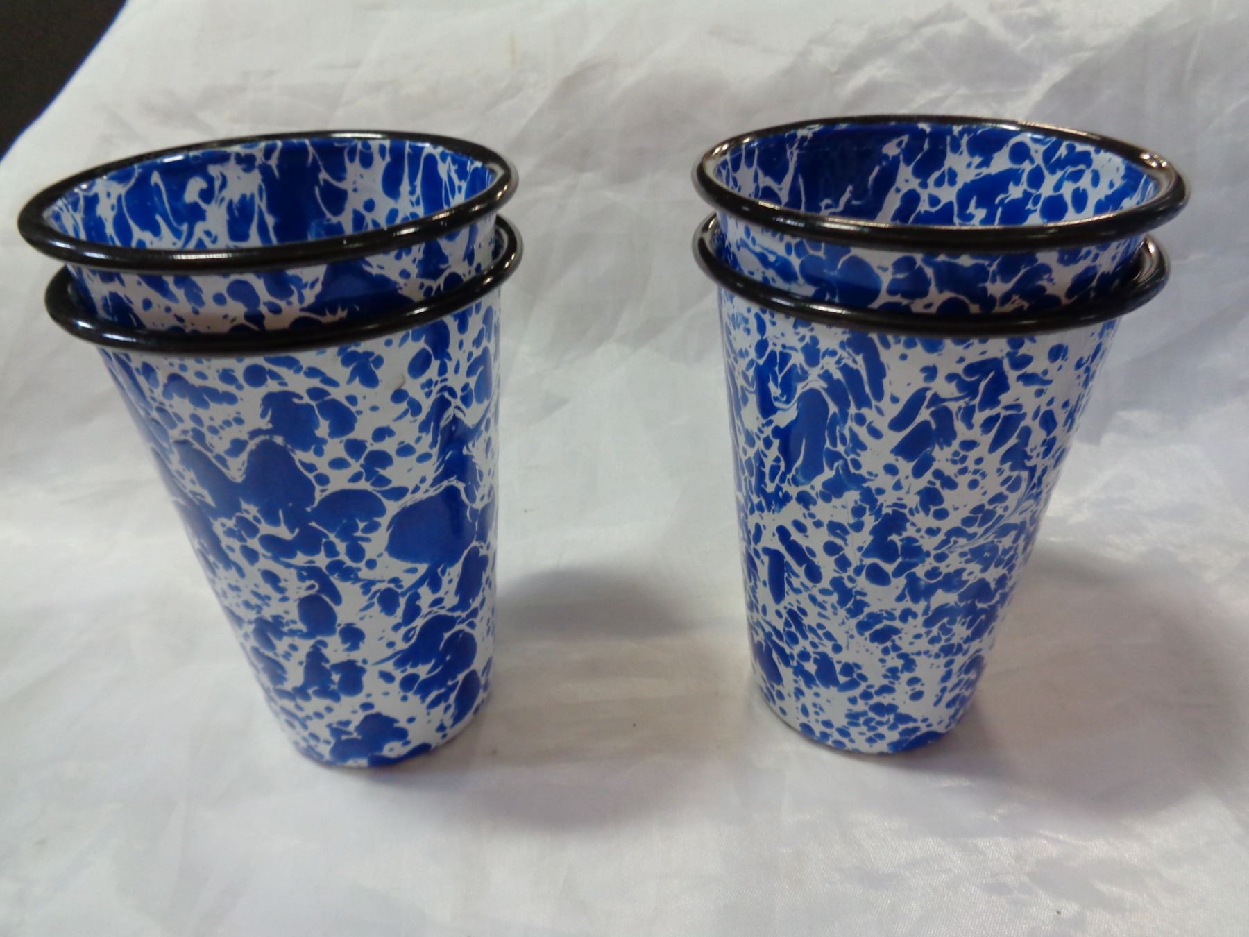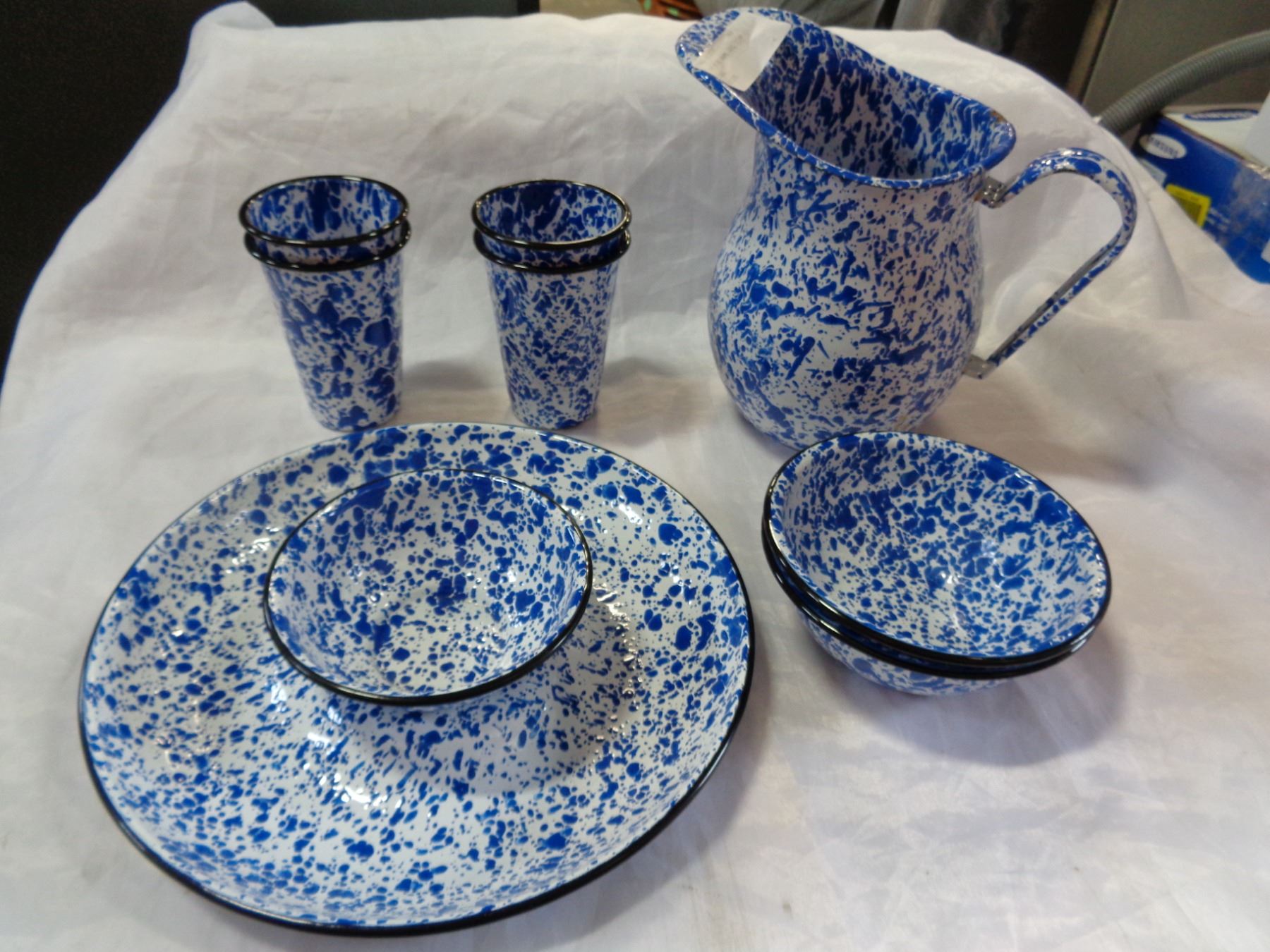 NEW REPRO ENAMEL JUG, DISH, BOWLS, AND CUPS