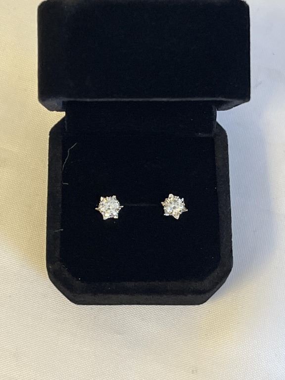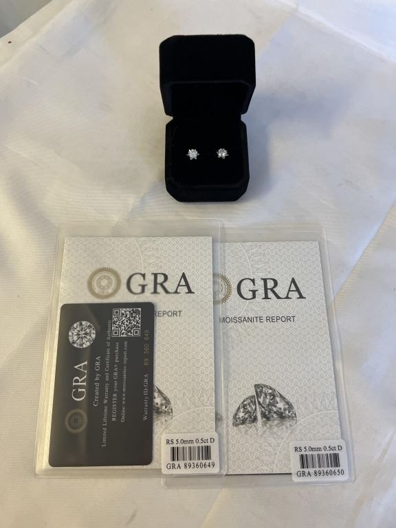 NEW S925 0.5CT EACH MOISSANITE SNOWFLAKE STUD EARRINGS, MOUNTED IN 925 STERLING SILVER W/ WHITE GOLD OVERLAY D-VVS1 GRA REPORT (TESTS POSITIVE W/ DIAMOND TESTER)