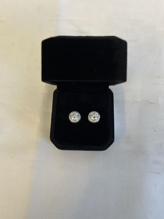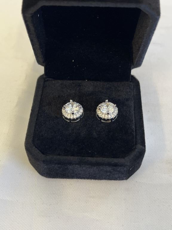 NEW S925 1.0CT EACH SIMULATED DIAMOND (CZ) HALO STUD EARRINGS MOUNTED IN 925 STERLING SILVER W/ WHITE GOLD OVERLAY