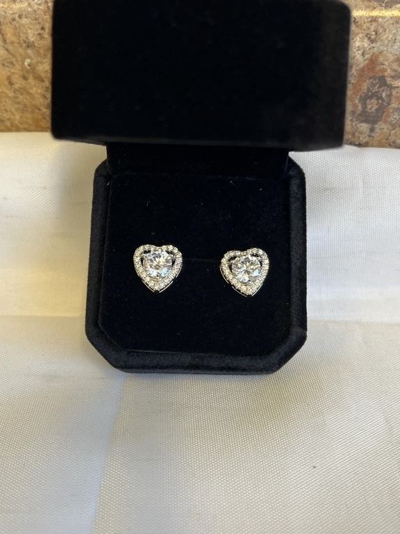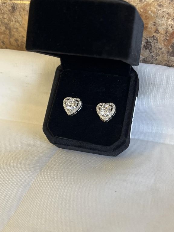NEW S925 1.0CT EACH SIMULATED DIAMOND (CZ) HEART HALO STUD EARRINGS, MOUNTED IN 925 STERLING SILVER W/ WHITE GOLD OVERLAY