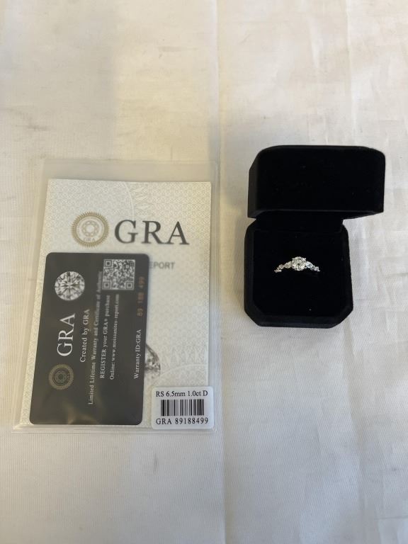 NEW S925 1.0CT MOISSANITE LAB DIAMOND LADIES RING, MOUNTED IN 925 STERLING SILVER W/ WHITE GOLD OVERLAY, D-VVS1, GRA REPORT (TESTS POSITIVE W/ DIAMOND TESTER)