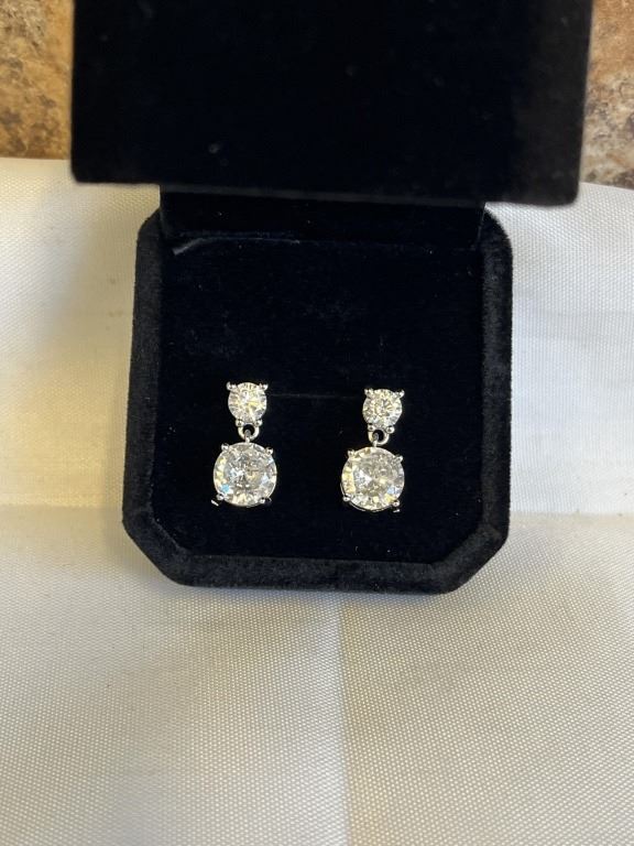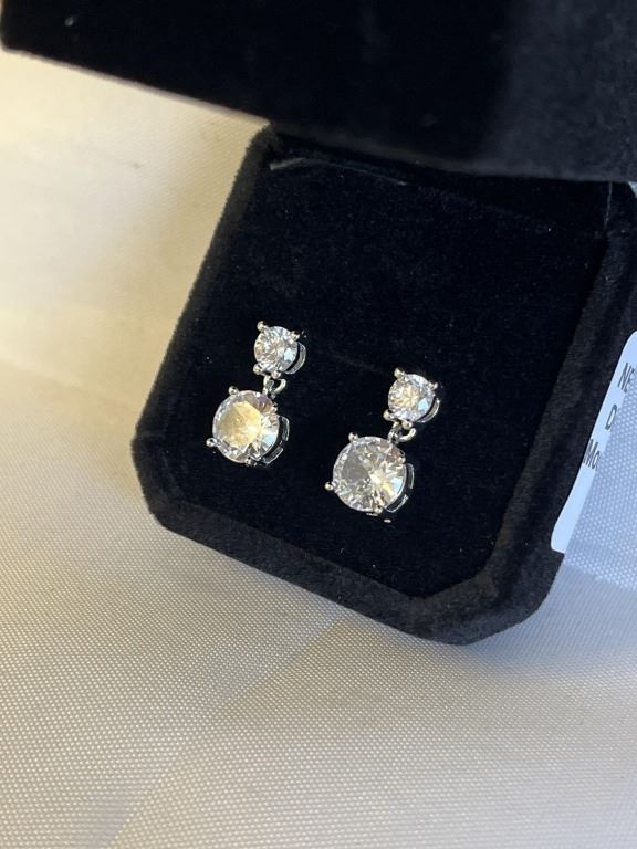 NEW S925 2.0CT EACH SIMULATED DIAMOND (CZ) DANGLE EARRINGS MOUNTED IN 925 STERLING SILVER W/ WHITE GOLD OVERLAY