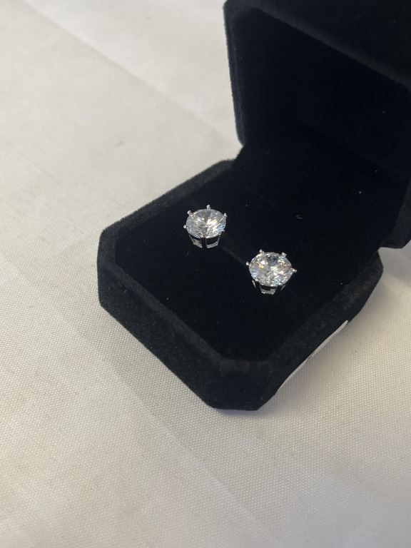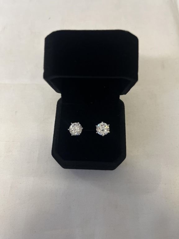 NEW S925 3.0CT EACH SIMULATED DIAMOND (CZ) STUD EARRINGS, MOUNTED IN 925 STERLING SILVER W/ WHITE GOLD OVERLAY