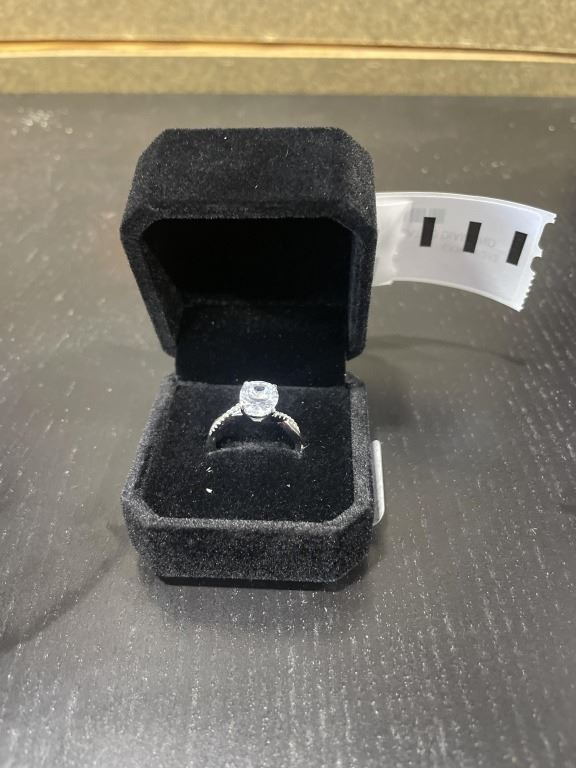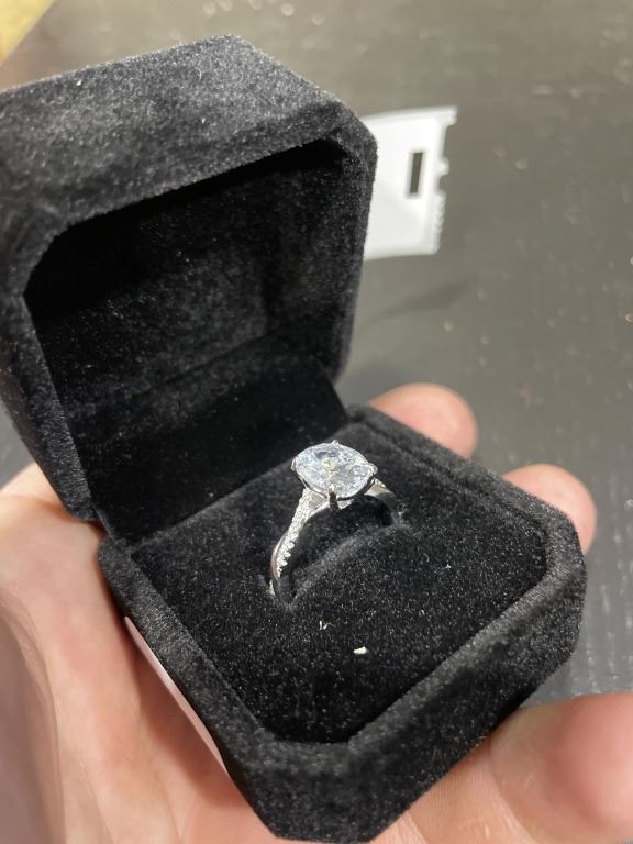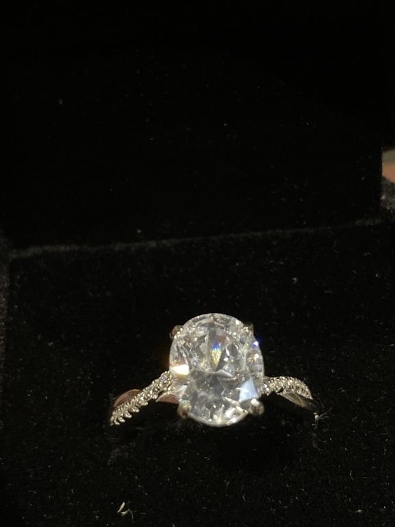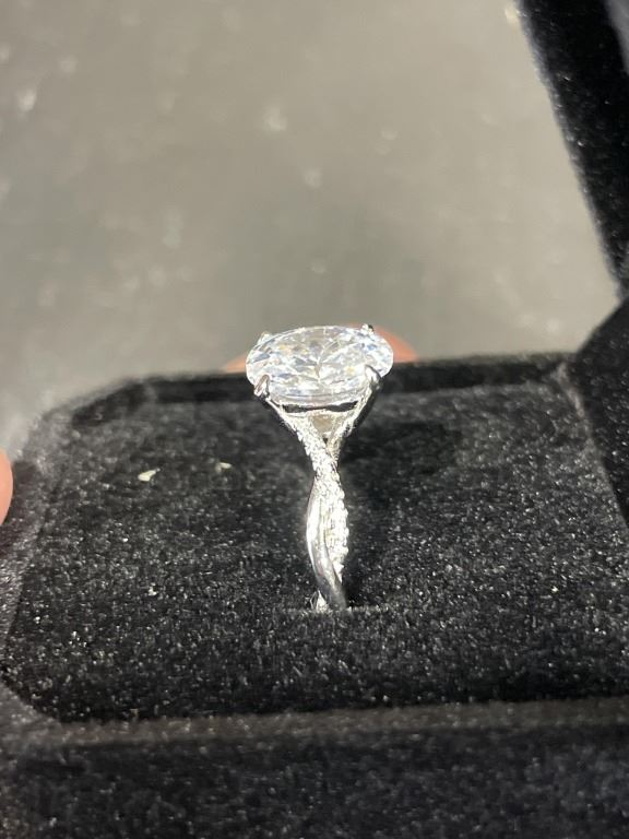 NEW S925 4.0CT OVAL CUT SIMULATED DIAMOND (CZ) TWIST RING SIZE 7.5 MOUNTED IN 925 STERLING SILVER W/ WHITE GOLD OVERLAY