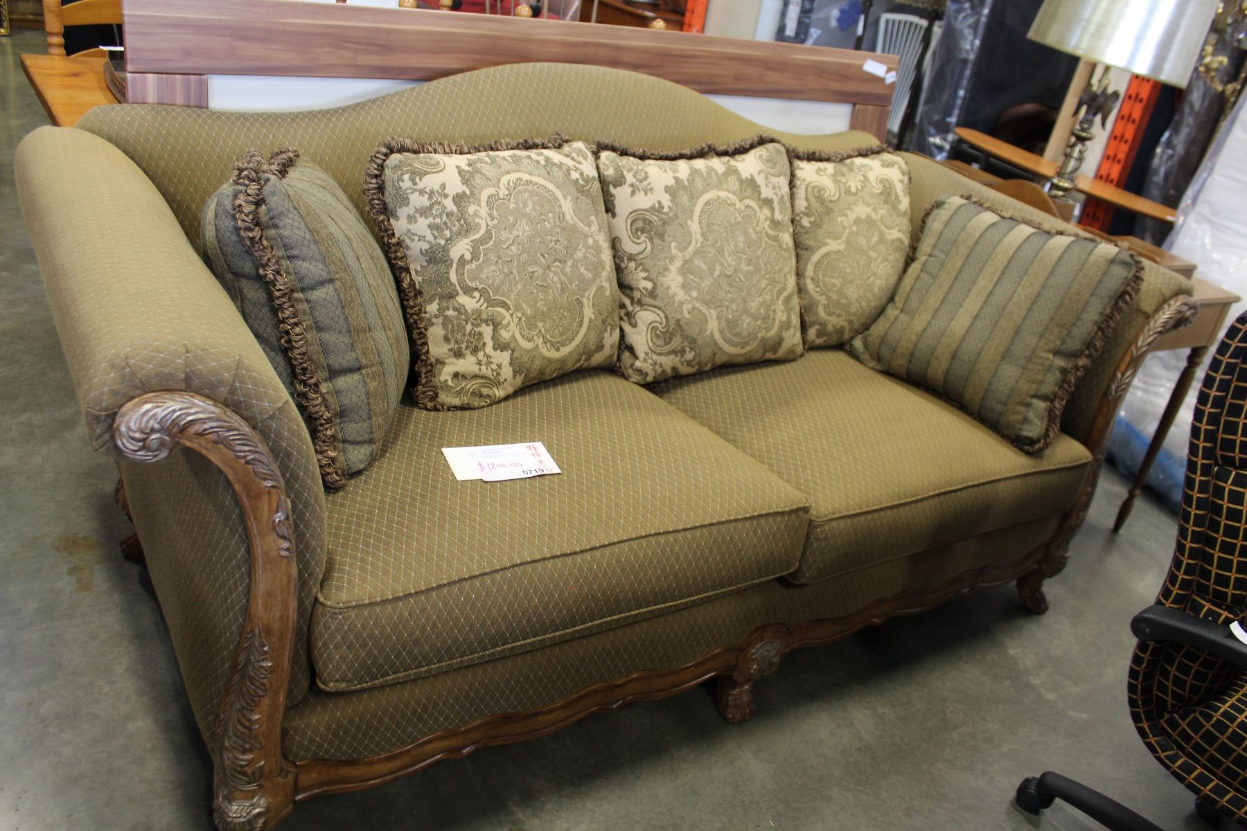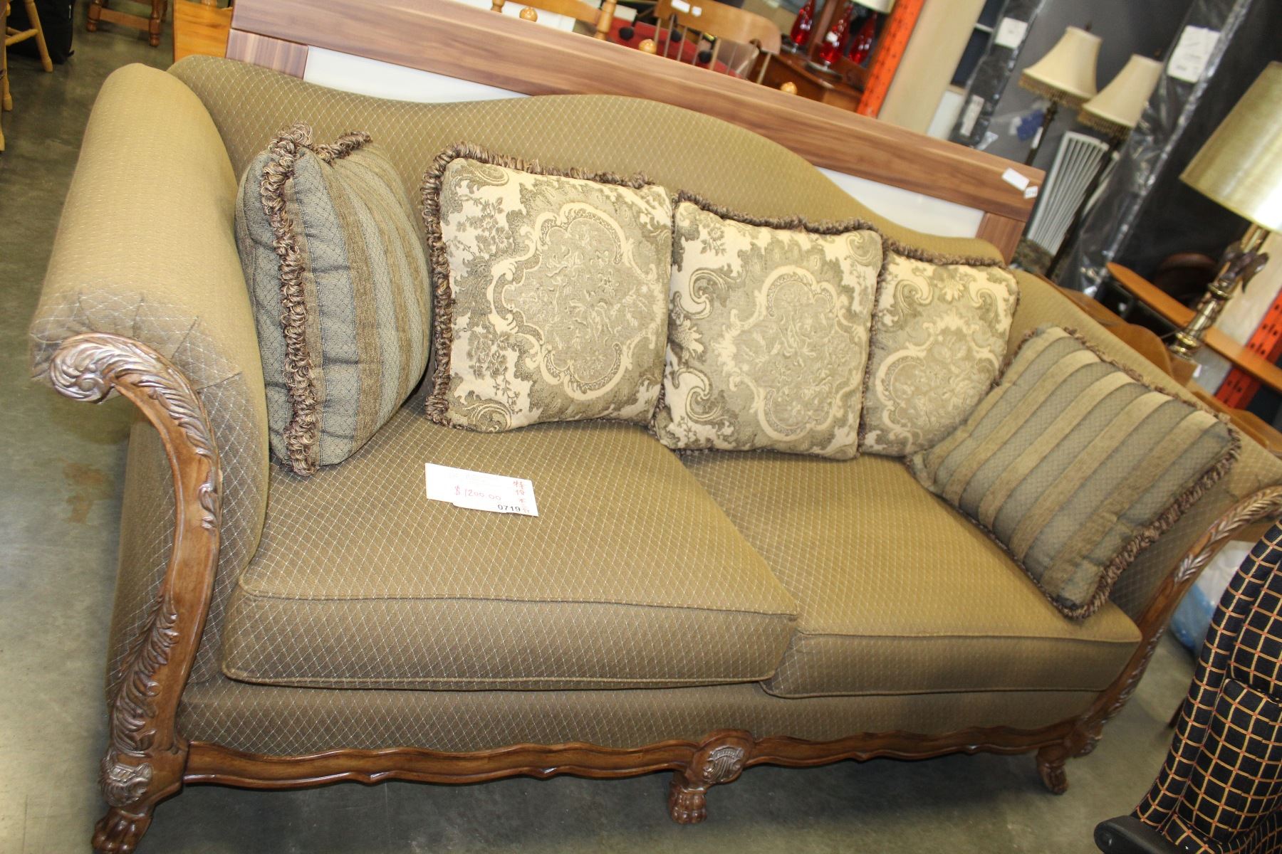 NEW SCHNADIG CONTEMPORARY ROLLED ARM SOFA WITH WOOD ACCENTS AND THROW PILLOWS RETAIL $2400