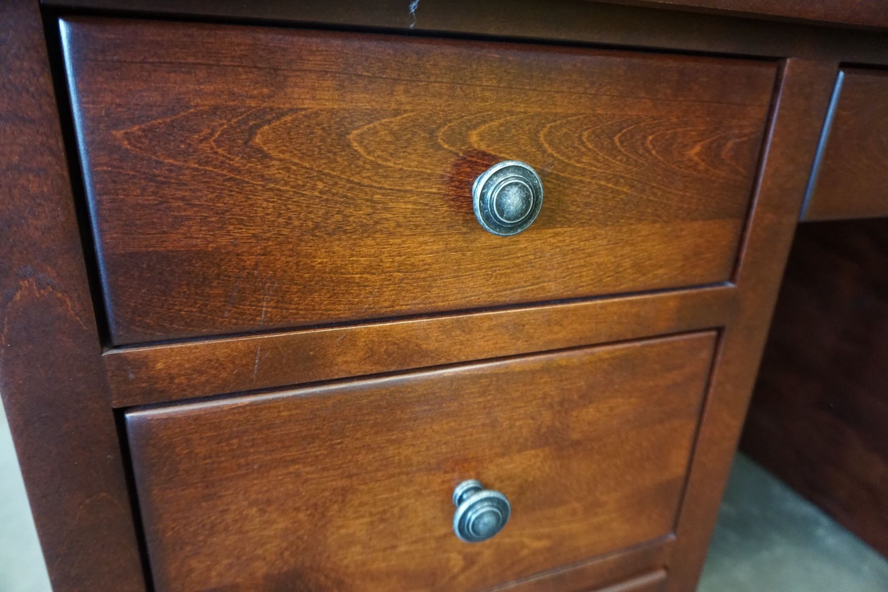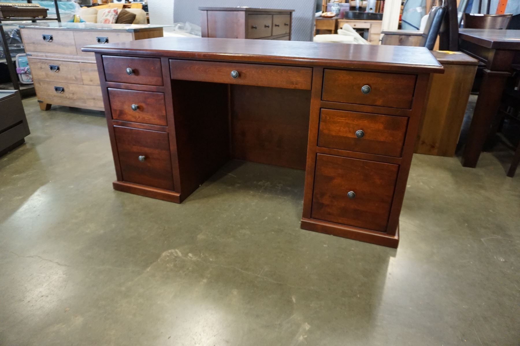 NEW SOLID MAPLE 7 DRAWER OFFICE DESK, FINISHED BACK, DOVETAILED DRAWERS, EXTENSION DRAWER GLIDES, ANTIQUE BLACK KNOBS, MADE IN LANGLEY, B.C. WHOLESALE COST IS $1625 RETAIL $2439