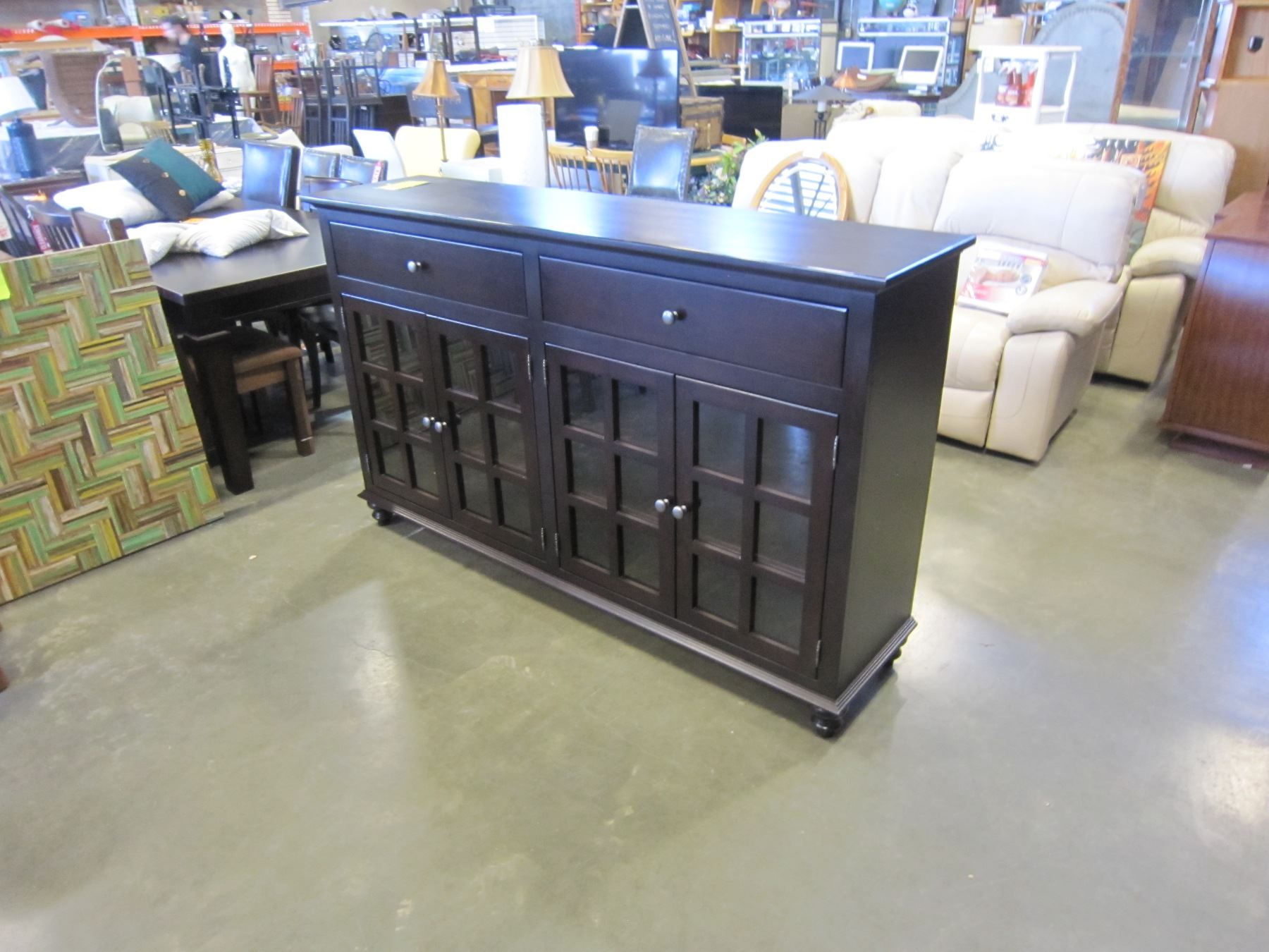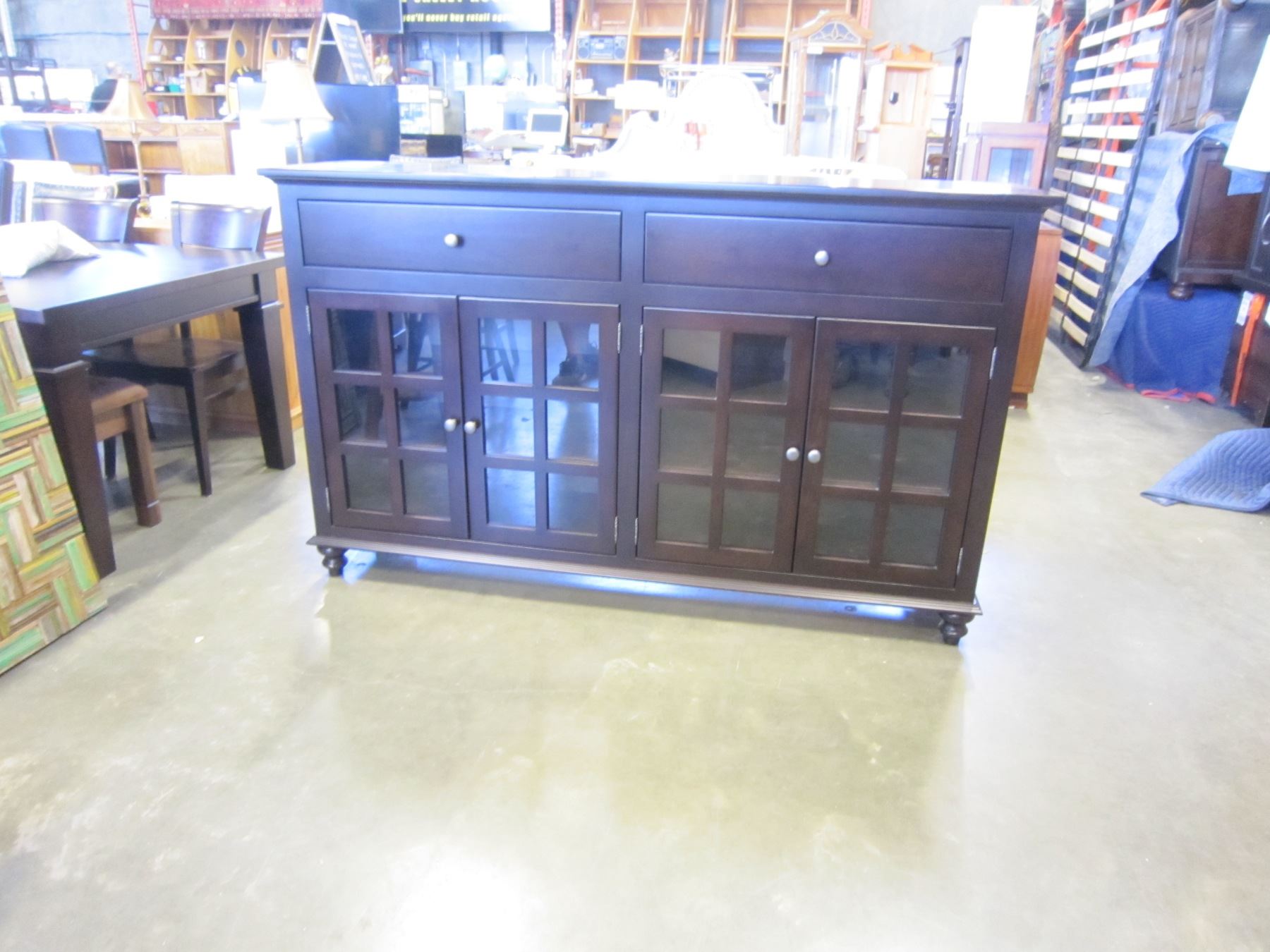 NEW SOLID MAPLE 72 INCH SERVER, MULLION GLASS DOORS, DOVETAILED DRAWERS, ACCURIDE DRAWER GLIDES, HICKORY STAIN, BRUSHED NICKEL HARDWARE, CUSTOM BUILT IN CANADA, WHOLESALE COST $1675 CURRENT RETAIL COST $2599