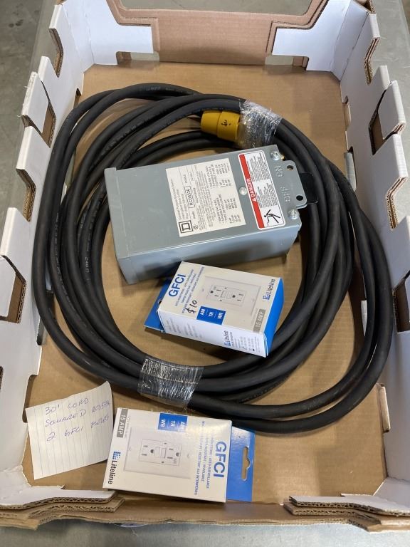 NEW SQAURE D ENCLOSED SWITCH BOX, HEAVY DUTY 30FT POWER CORD, AND 2NEW GFCI PLUG