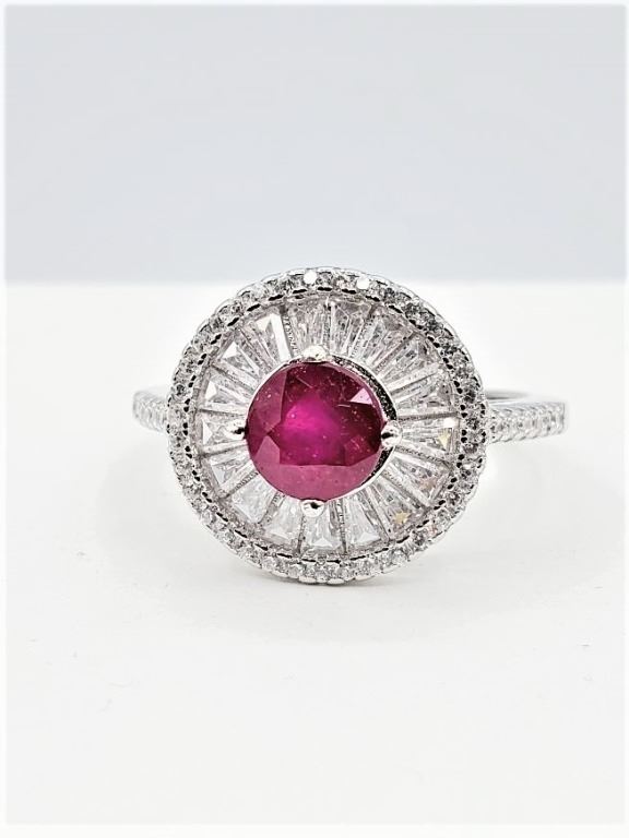 NEW STERLING SILVER 5.95MM NATURAL ENHANCED RUBY (1.1CTS) & CZ RING, W/A $680.00, SIZE 8, RUBY IS THE BIRTHSTONE FOR JULY.