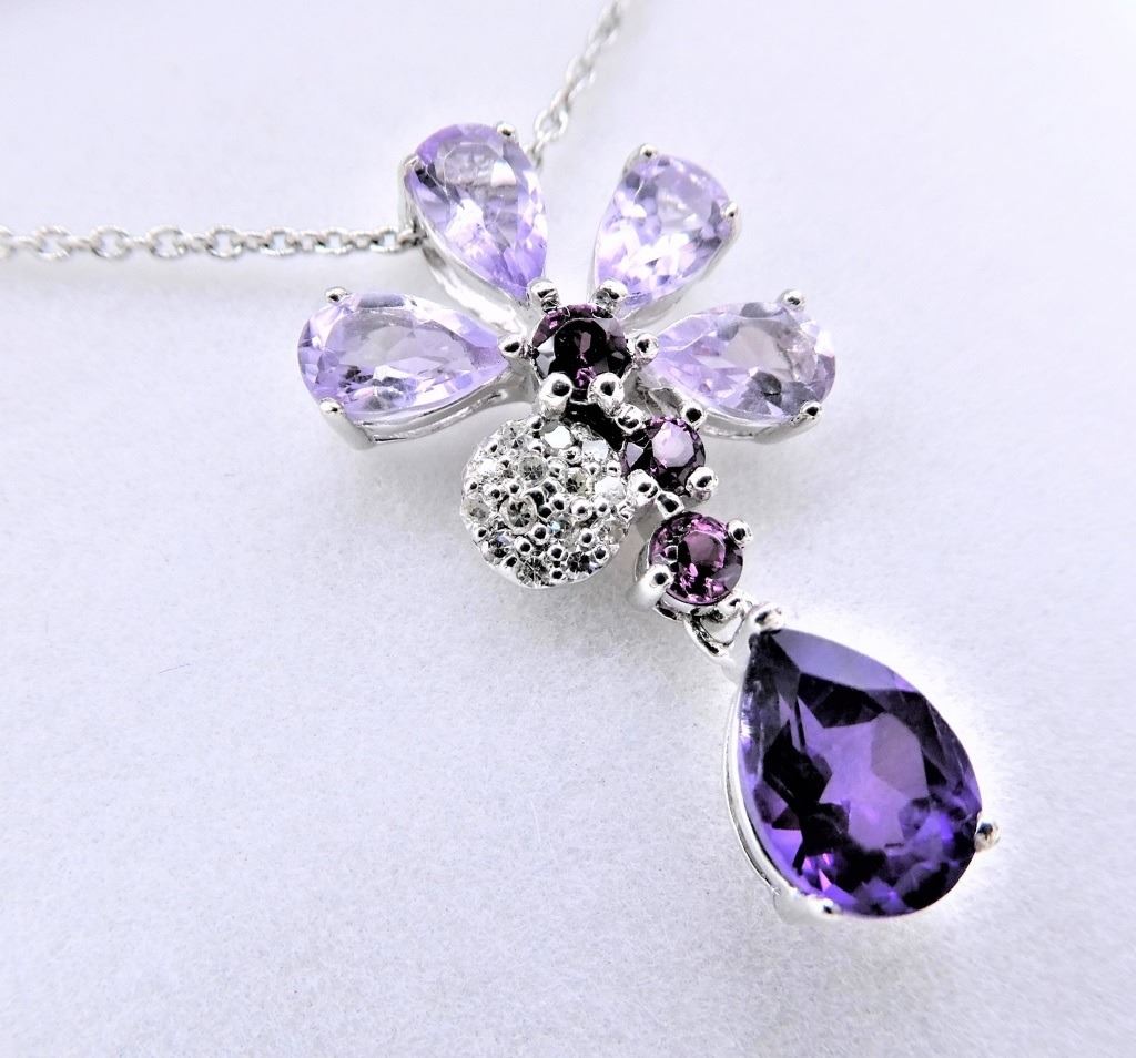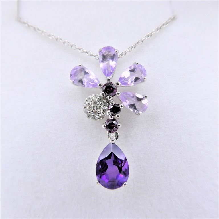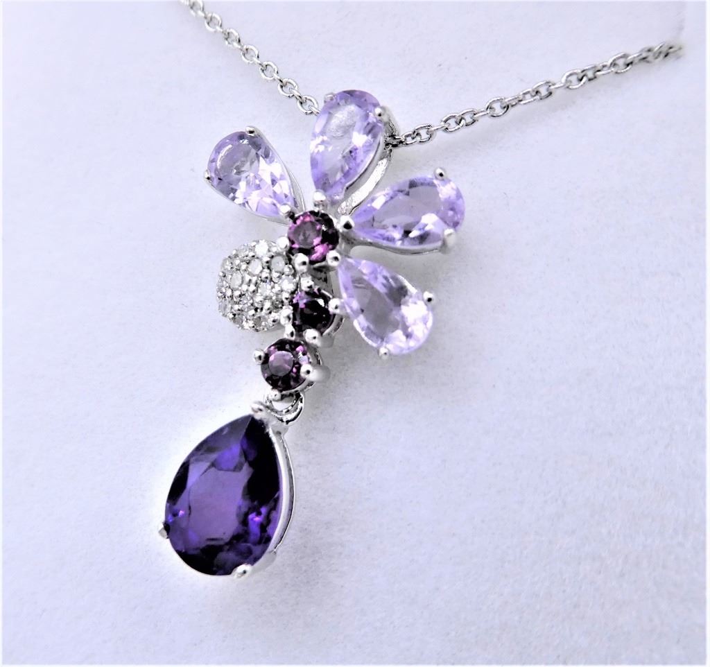 NEW STERLING SILVER GENUINE AMETHYST AND DIAMOND FORAL PENDANT W/ STERLING CHAIN W/ APPRAISAL $1040