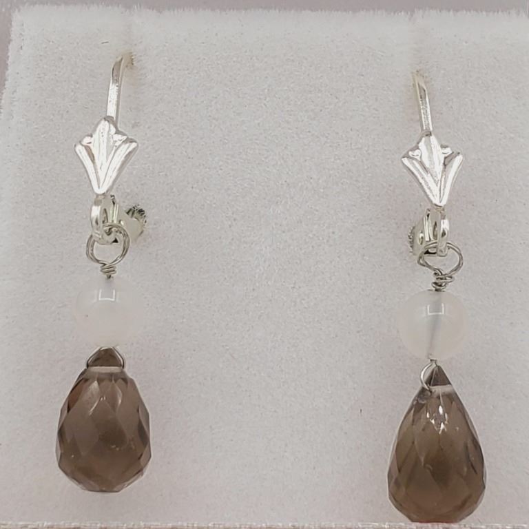 NEW STERLING SILVER GENUINE SMOKY QUARTZ AND MOONSTONE BRIOLETTE EARRINGS - RETAIL $150