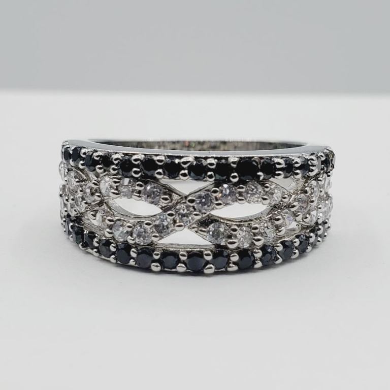 NEW STERLING SILVER PLATED BLACK & WHITE CZ RING, RETAIL $100.00, SIZE 7