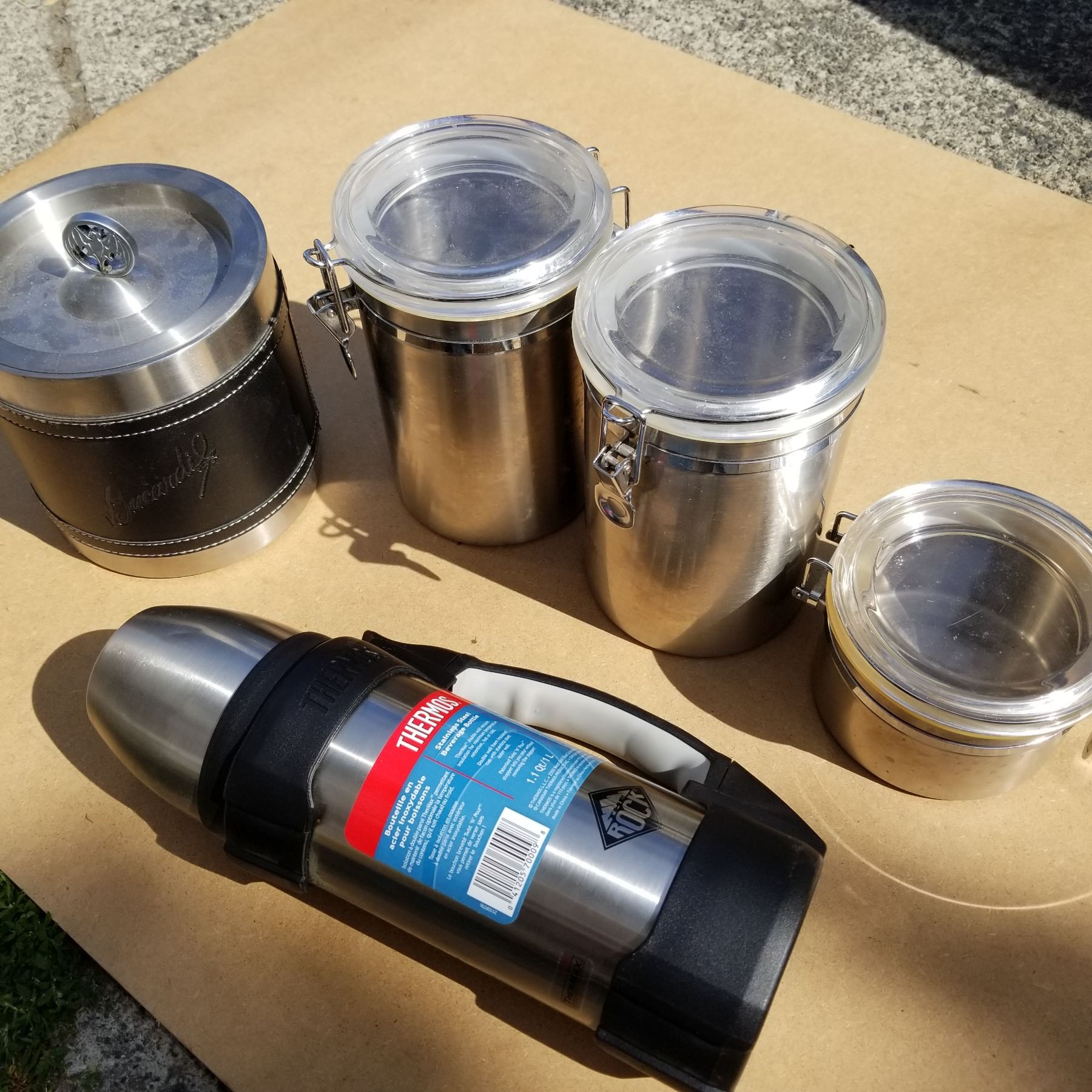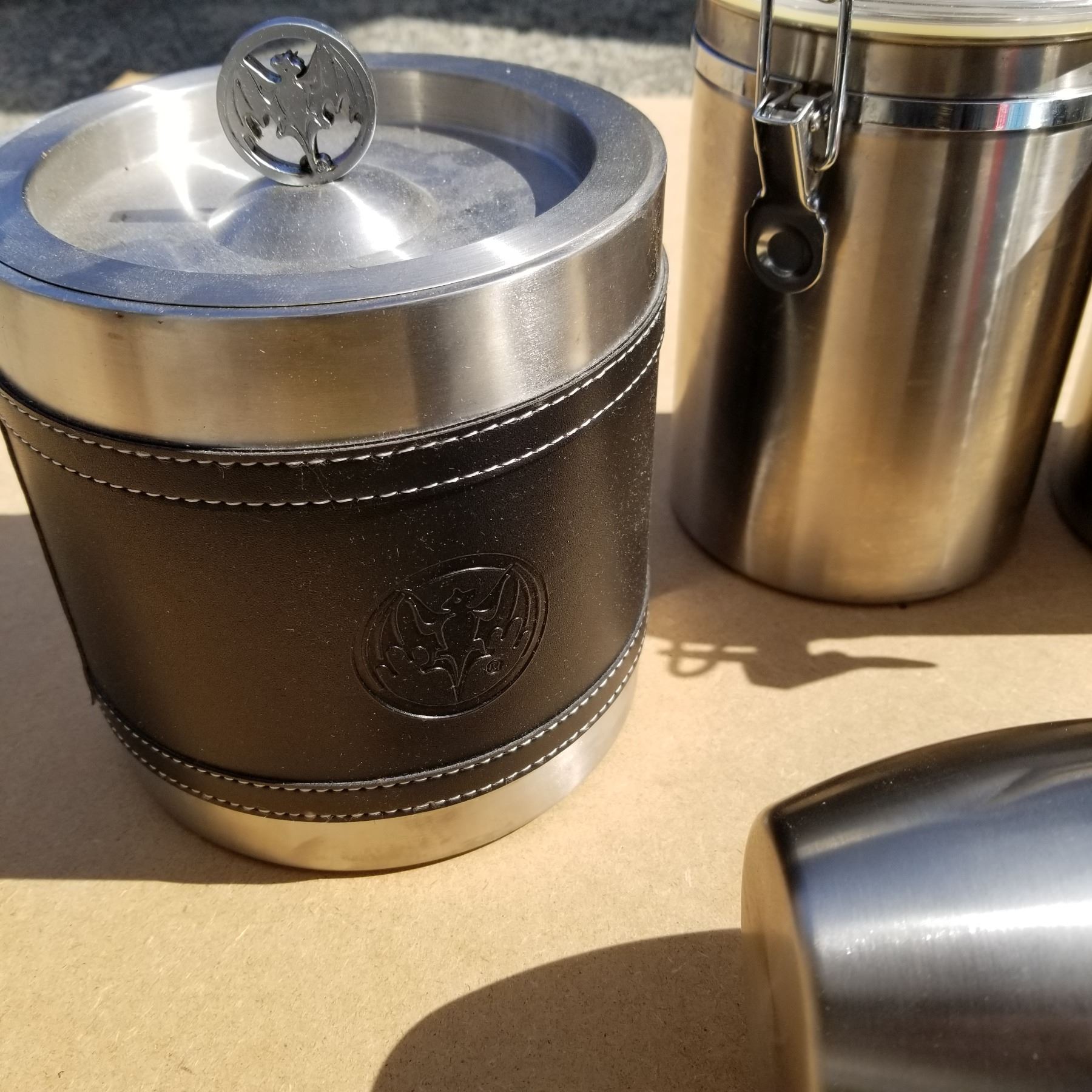 NEW THE ROCK THERMOS, STAINLESS STEEL CANISTERS WITH LIDS AND BACARDI ICE BUCKET WITH TONGS