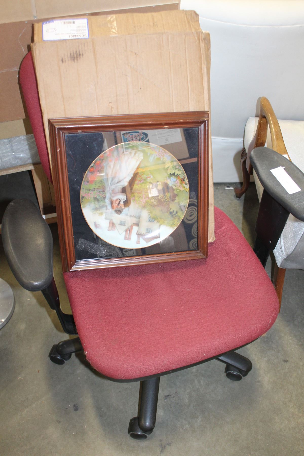 NEW TOILET SEAT AND OFFICE CHAIR AND FRAMED COLLECTOR PLATE