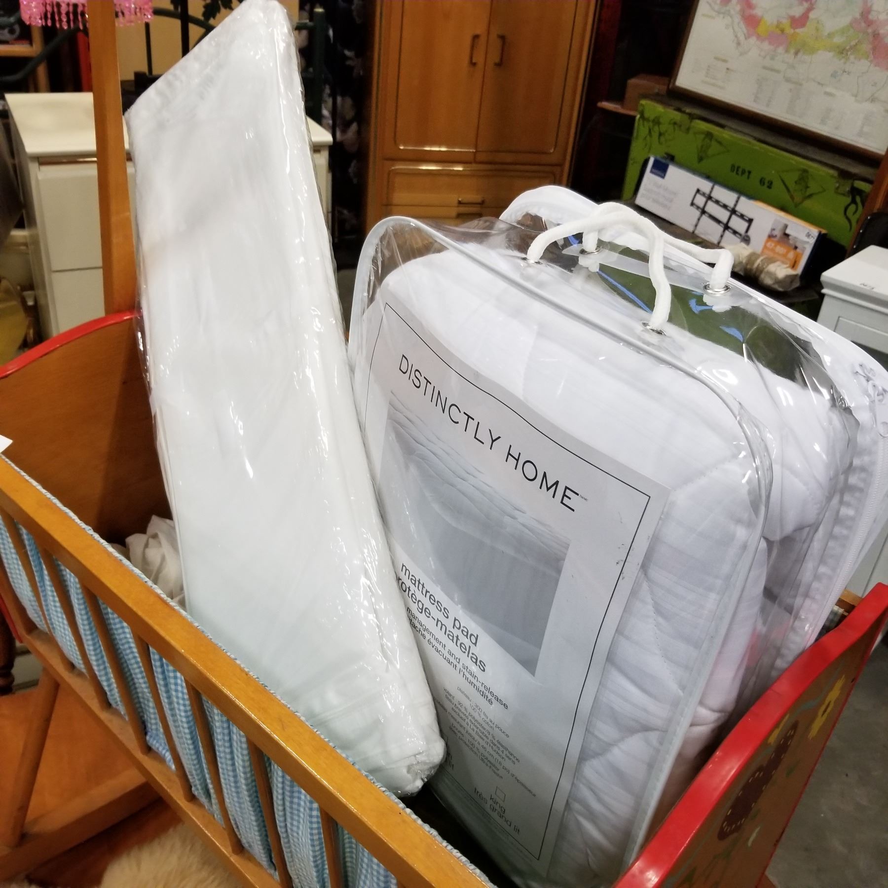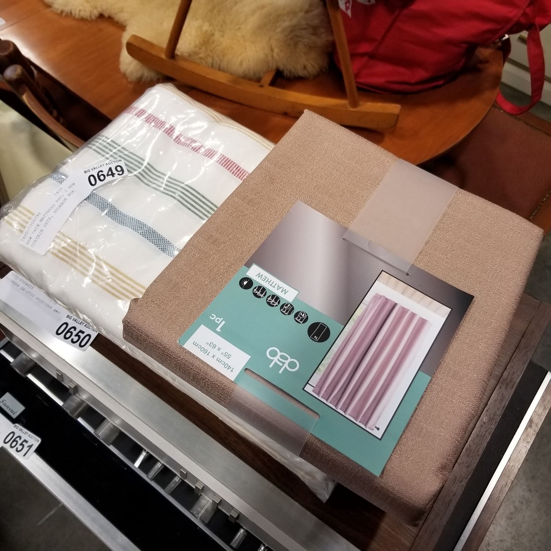NEW TWIN MATTRESS PAD, 2 NEW CURTAIN SETS, STORAGE BOX