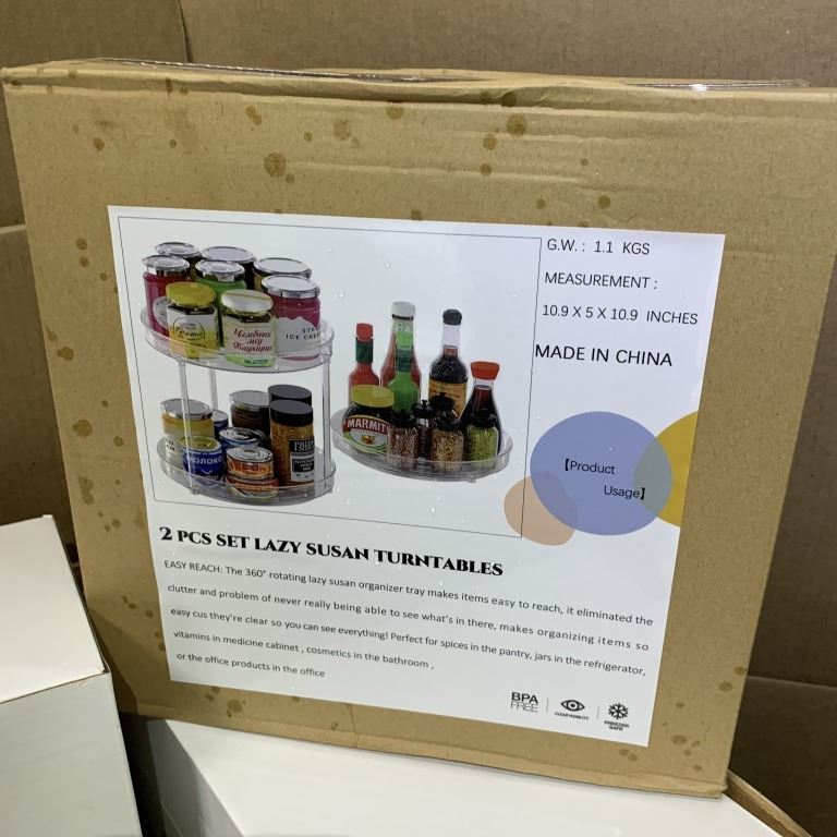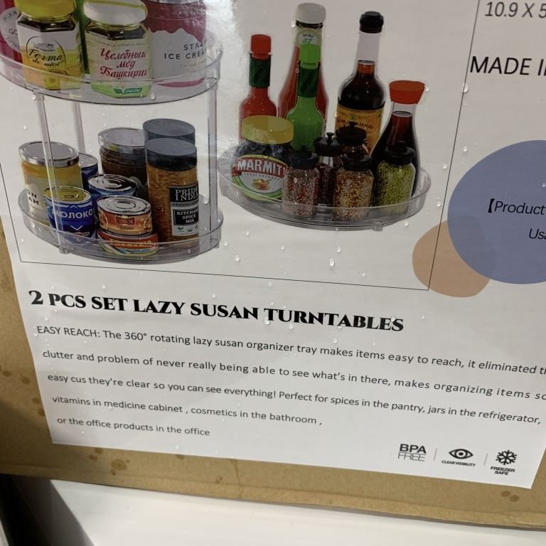 NEW TWO-PIECE LAZY SUSAN TURNTABLES SET AND TWO NEW SIX PIECE REFRIGERATOR BIN SETS