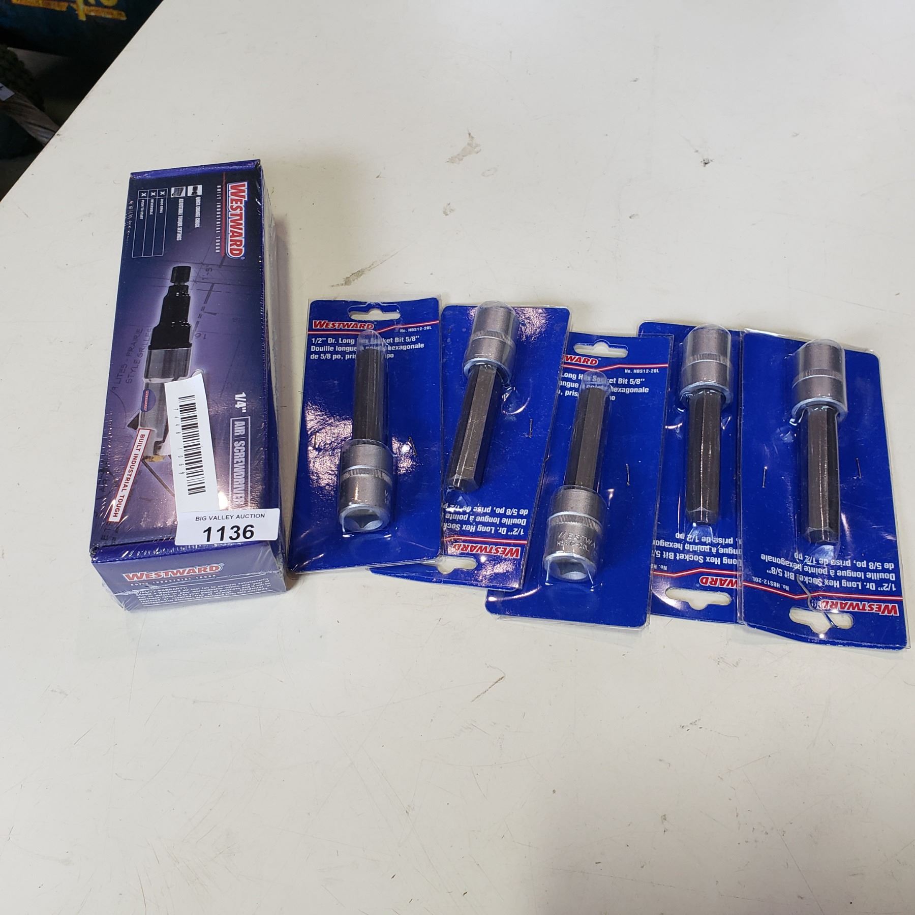 NEW WESTWARD QUARTER INCH AIR SAW SCREWDRIVER AND 5-1/2 INCH DRIVE LONG HEX SOCKET