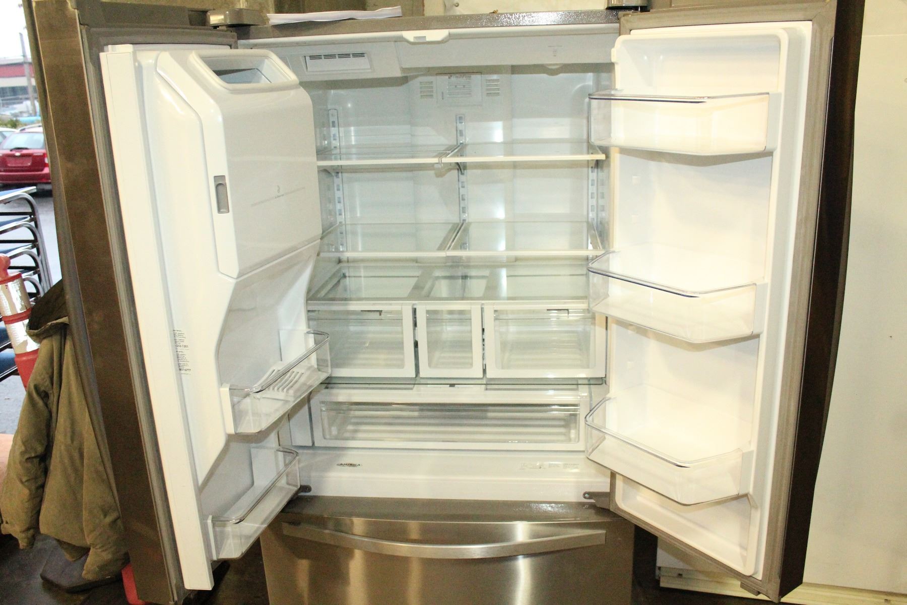 NEW WHIRLPOOL STAINLESS FRENCH DOOR REFRIDGERATOR WITH BOTTOM FREEZER WITH WATER AND ICE, RETAIL $2899 36 INCH WIDE 32 INCH DEEP