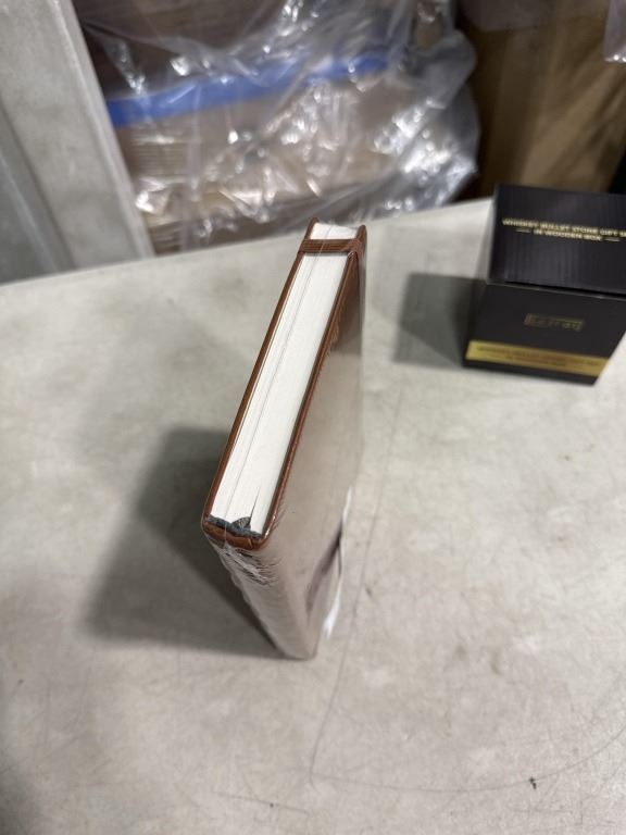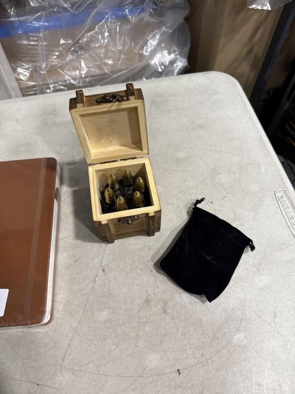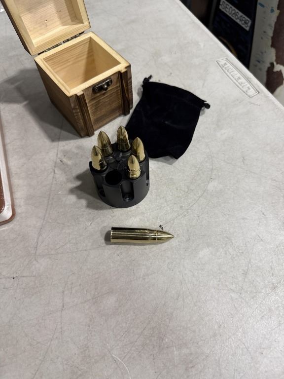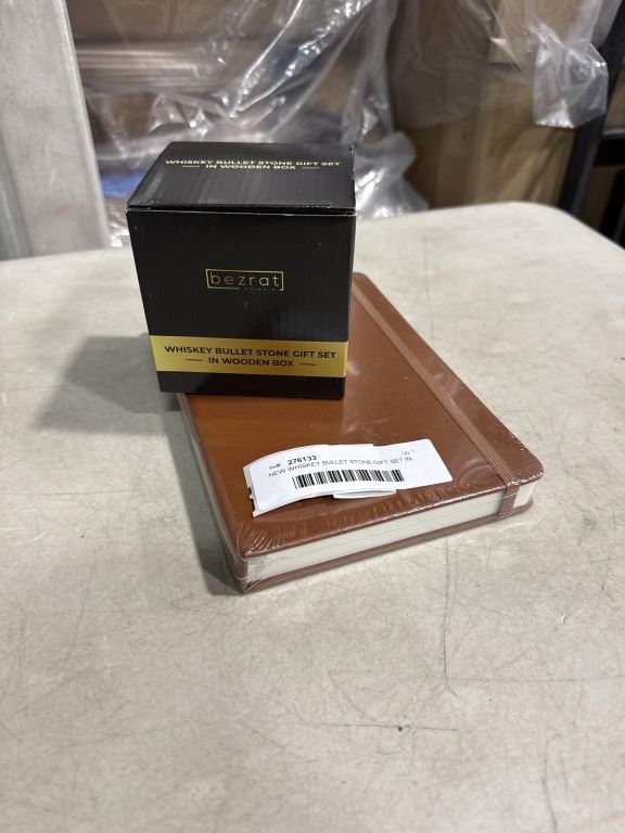 NEW WHISKEY BULLET STONE GIFT SET IN WOODEN BOX AND NEW A5 BROWN LEATHER NOTEBOOK