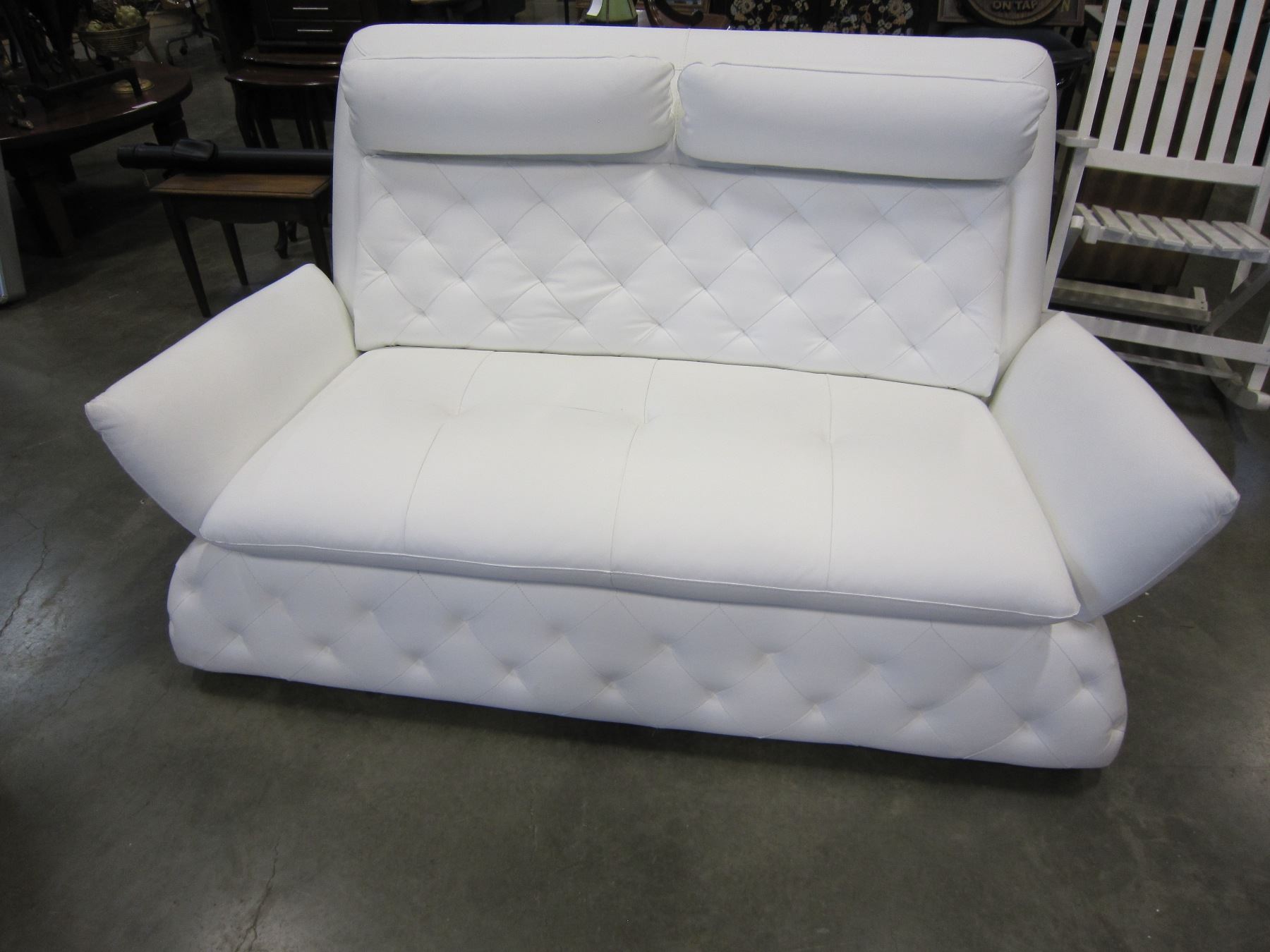 NEW WHITE GENUINE LEATHER TUFTED LOVESEAT WITH TALL BACK AND HEADREST, RETAIL $2899