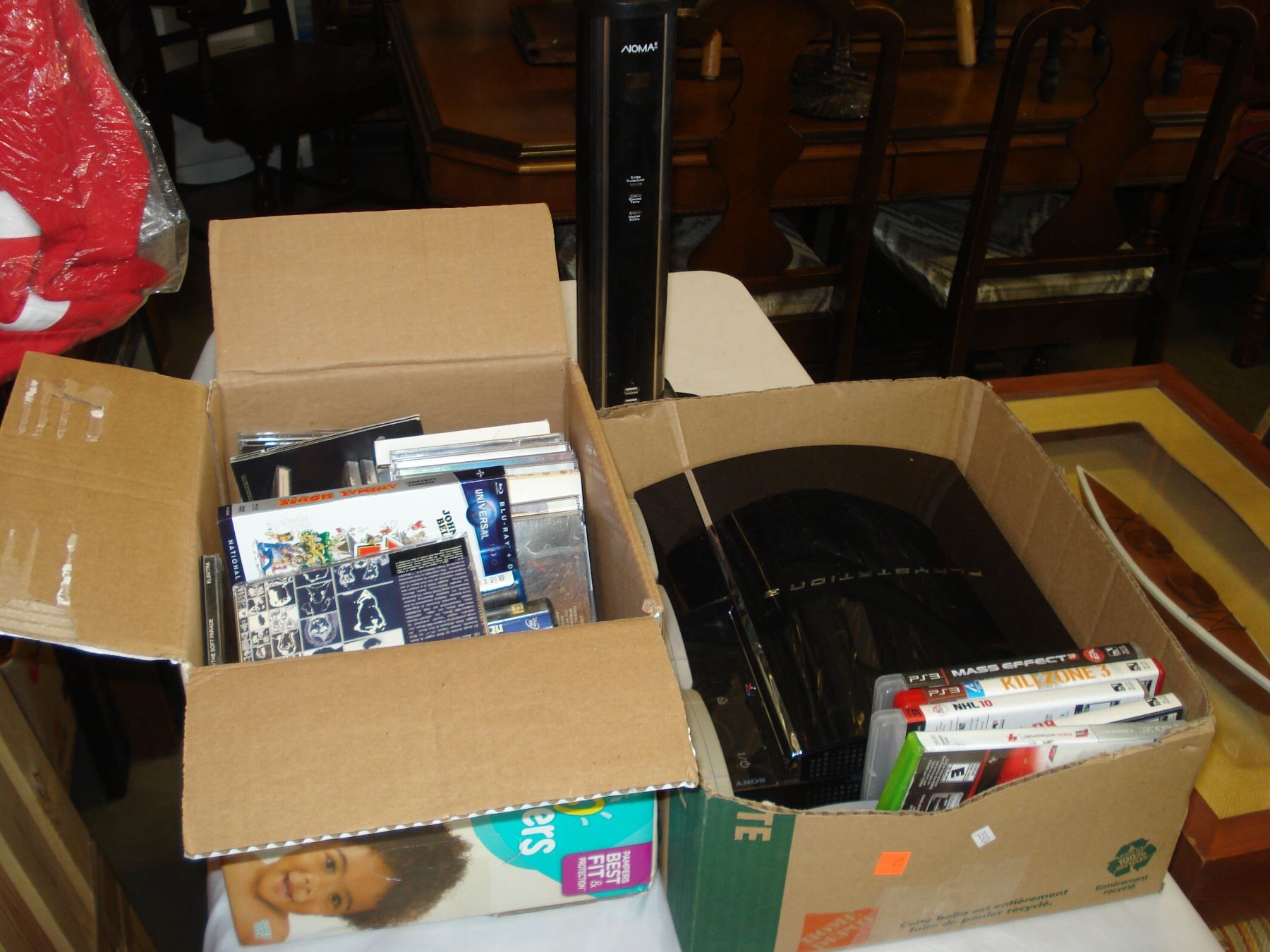 NINTENDO 64 AND OTHER VIDEO GAMES AND PS3 CONSOLE AND BOX OF CDS AND DVDS