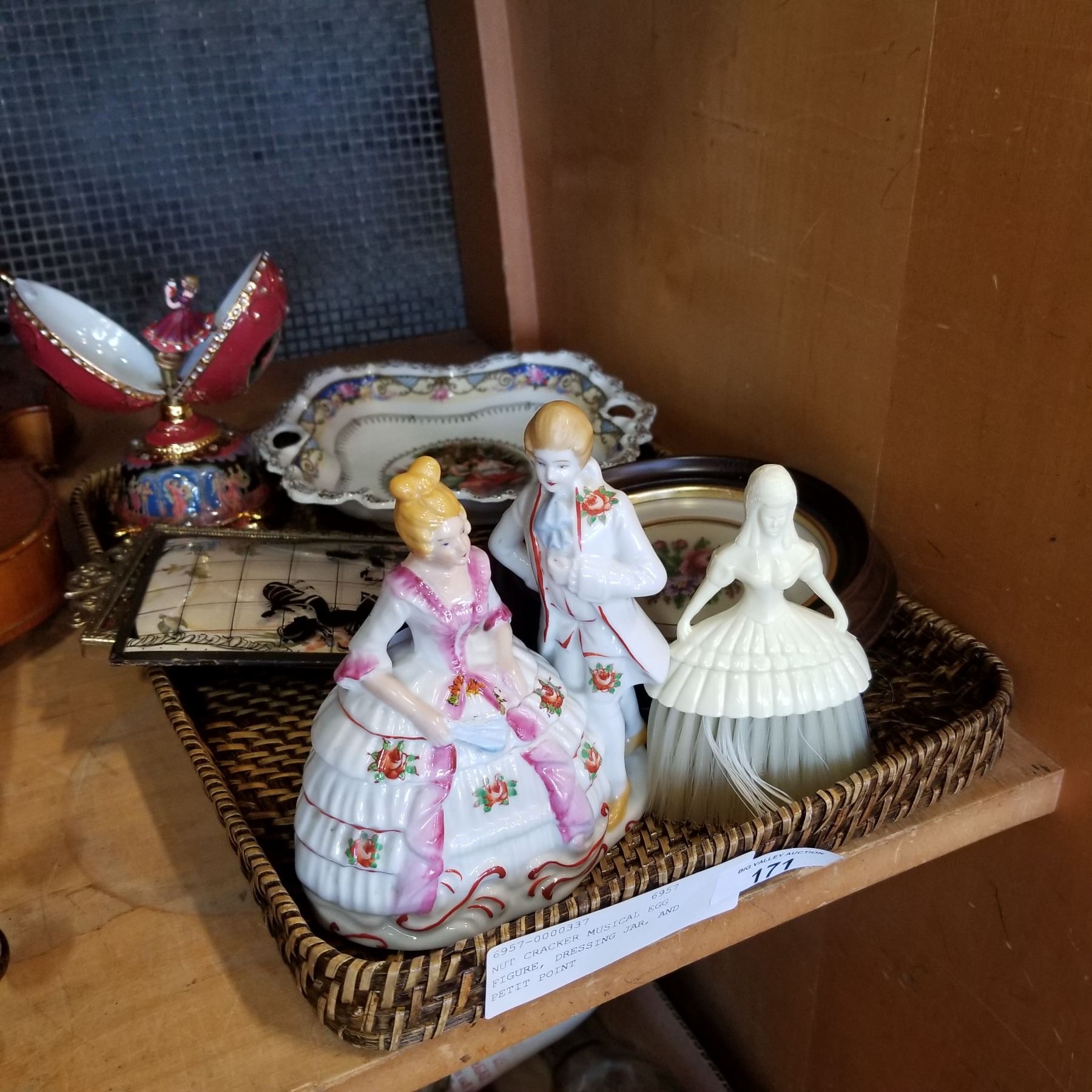 NUT CRACKER MUSICAL EGG FIGURE, DRESSING JAR, AND PETIT POINT