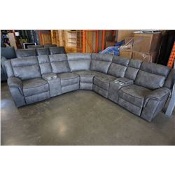 NEW MODERN GREY STITCHED PALOMINO FABRIC 3 PIECE SECTIONAL SOFA, WITH 3 POWER RECLINERS, 2 CONSOLES, AND ILLUMINATED CUP HOLDERS, RETAIL $4199