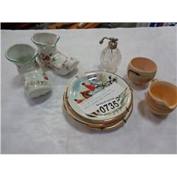 PAIR OF OLD FOLEY BOOTS AND VANITY DISHES AND POTTERY ETC