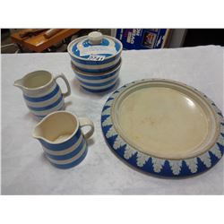 CORNISH WARE AND IRON STONE HANDLED DISHES AND WEDGEWOOD PLATE