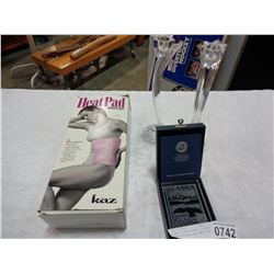 ALASKA ETCHED GLASS, 2 GLASS CANDLE STICKS, AND HEAT PAD
