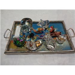LOT OF ANIMAL; ART GLASS ON VINTAGE TRAY SIGNED