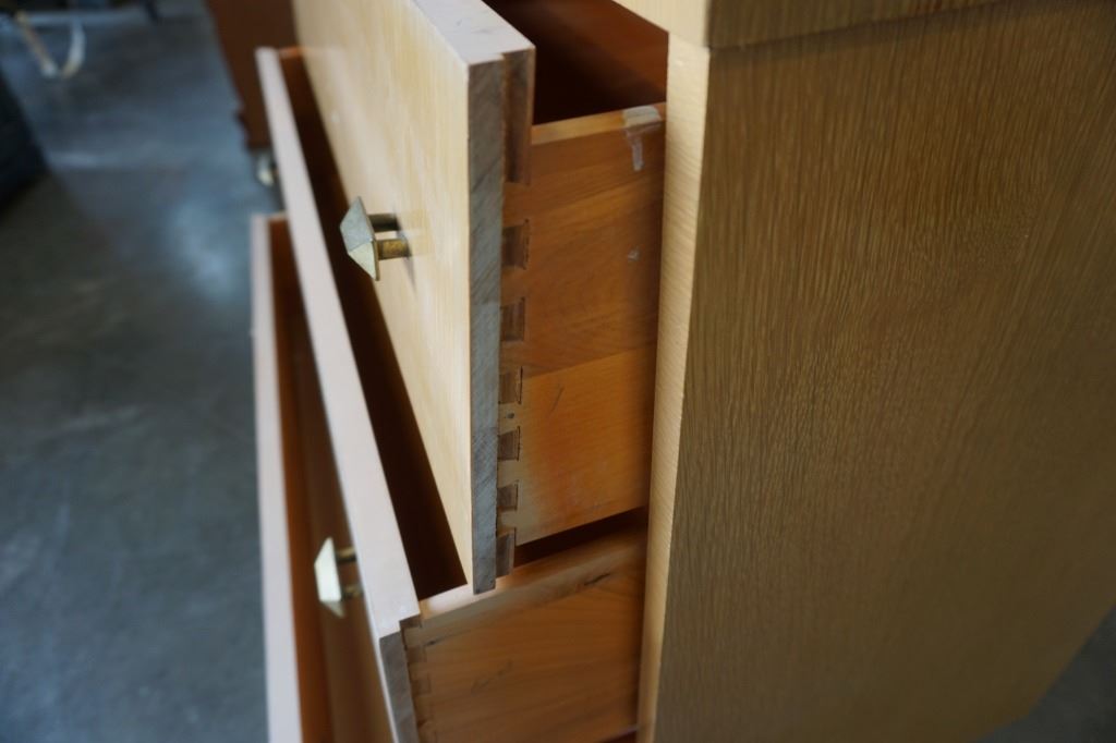 OAK 5 DRAWER GLASS DOOR DISPLAY CABINET - 62 INCHES TALL, 42 INCHES WIDE, 15 INCHES DEEP